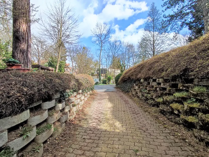 Durch eine gesicherte und sehr schöne Grünanlage gelangt man zu dem modernen Wohnhaus, in welchem sich die Garage befindet.