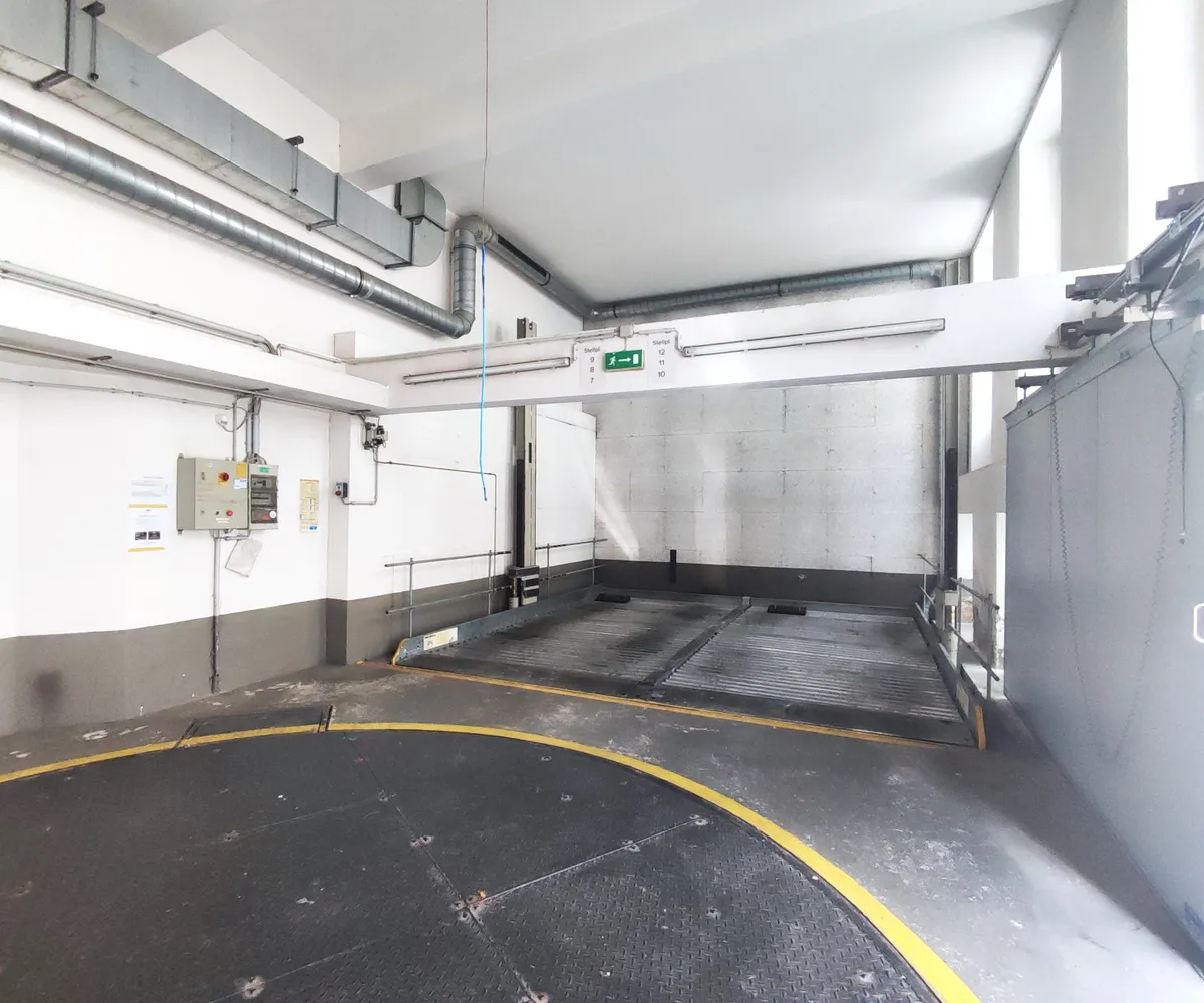 Zwei Tripple-Parkhebeanlagen mit Drehscheibe ermöglich Parken auf kleinem Raum. Maximale Fahrzeughöhe 1,50 m.