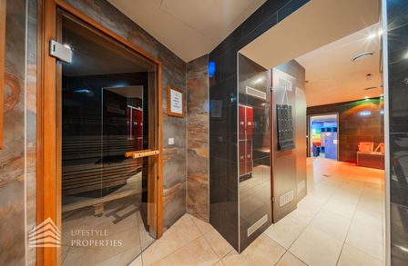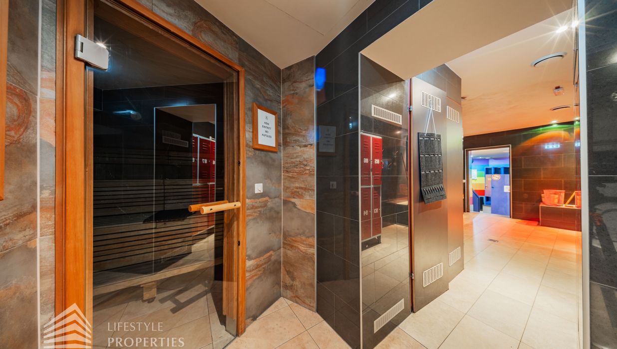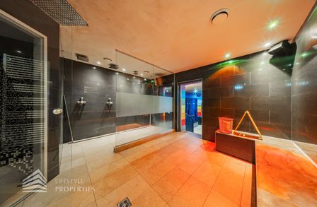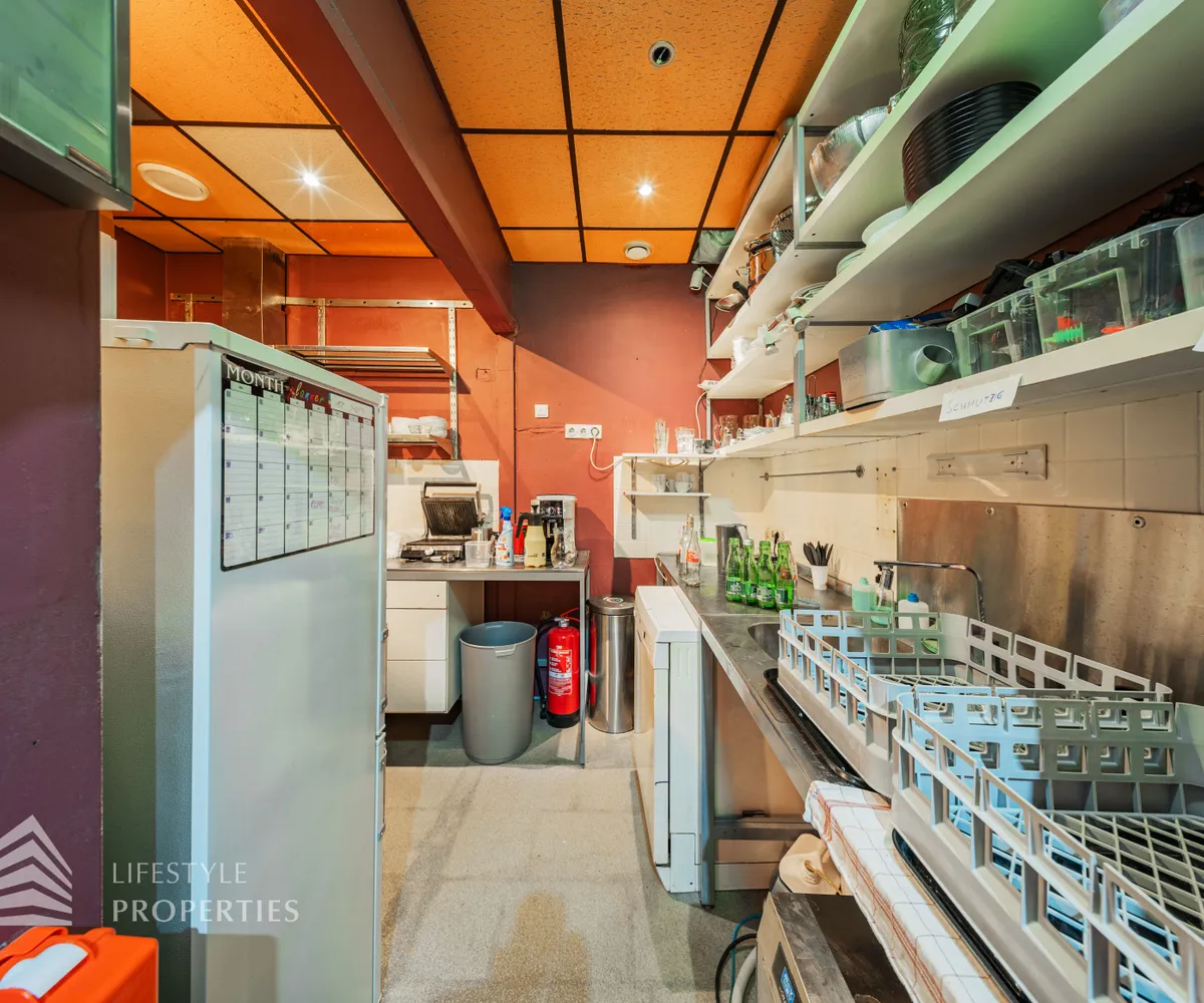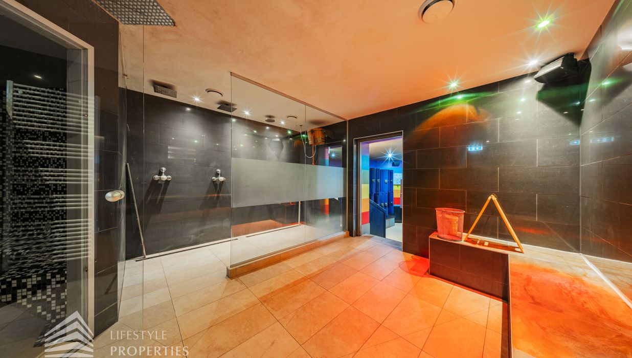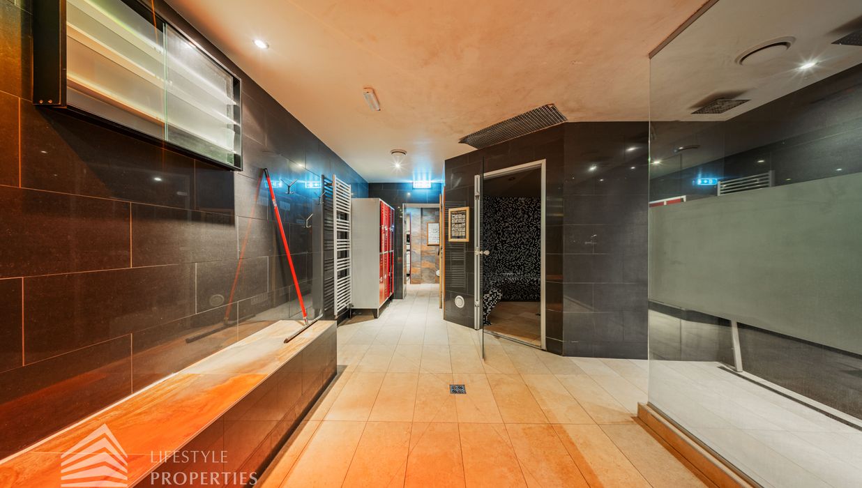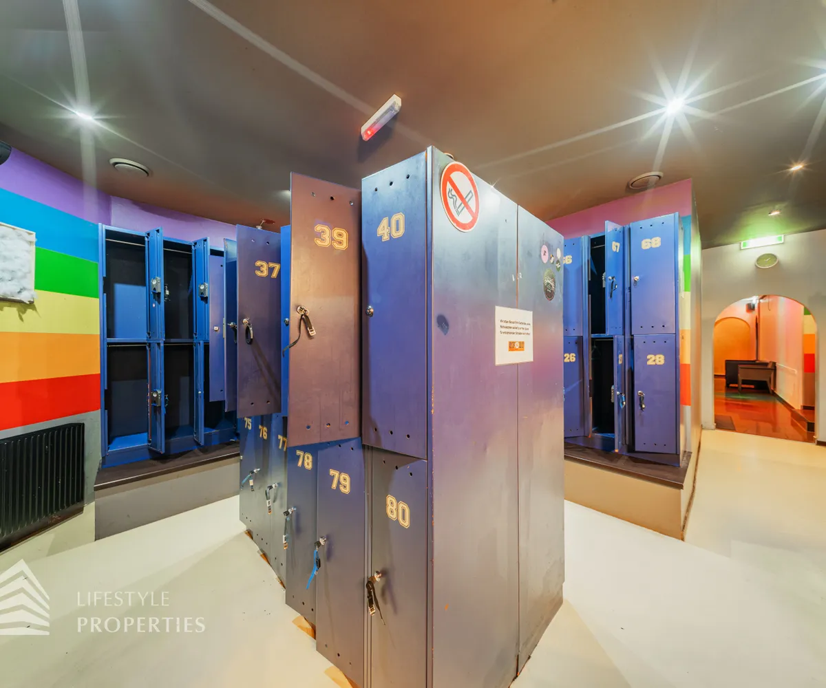 Das Objekt verfügt über eine vollausgestattete Küche mit Bar sowie über einen Saunabereich mit einer Finnischen Sauna und einem Dampfbad als auch einen Ruheraum. Des Weiteren gibt es geteilte Garderoben mit verschließbaren Spinten und ausreichend Duschen. Den Fitnessbereich kann man sowohl im Souterrain als auch im Keller auf verschiedene Flächen aufteilen. Es gibt auch abgetrennte Räume, diese sich für ein Solarium eignen.