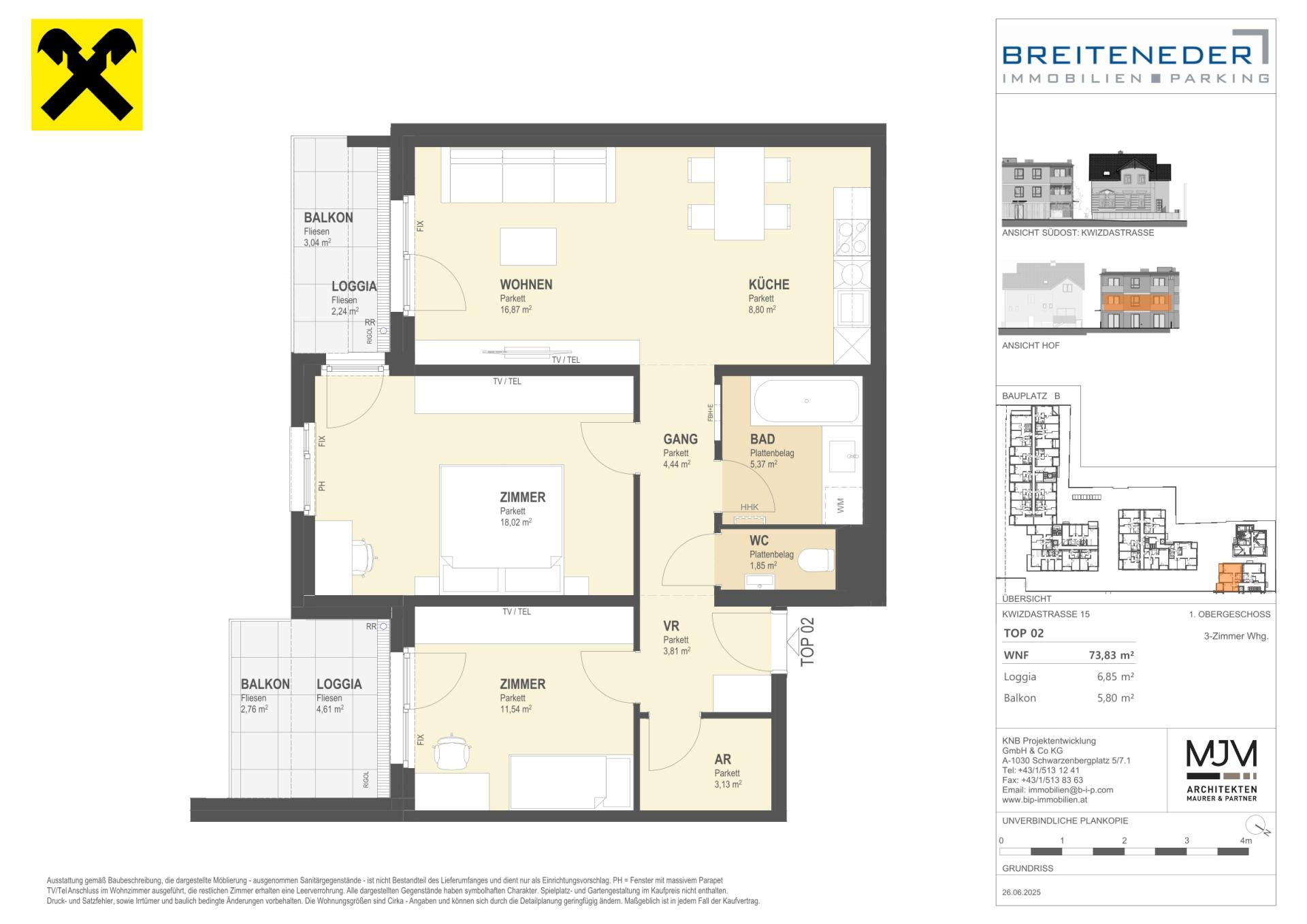 Kostentransparenz : Die ausgewiesenen Preise verstehen sich als Gesamtfixkaufpreise exklusive aller gesetzlichen Nebenkosten. Dazu zählen 3,5% Grunderwerbsteuer und 1,1% Grundbucheintragungsgebühr vom Gesamt-Kaufpreis sowie das Treuhandentgelt inklusive Vertragserrichtungsentgelt in Höhe von 1,5% vom Gesamt-Kaufpreis (zzgl. USt und Barauslagen). Für den Hauptwohnsitzerwerb in einem neu erworbenen Eigenheim entfallen von Juli 2024 bis Juli 2026 die Grundbuch- und Pfandrechtseintragungsgebühren bis zu einem Wert von 500.000 Euro (für übersteigende Beträge ist die Gebühr zu entrichten).