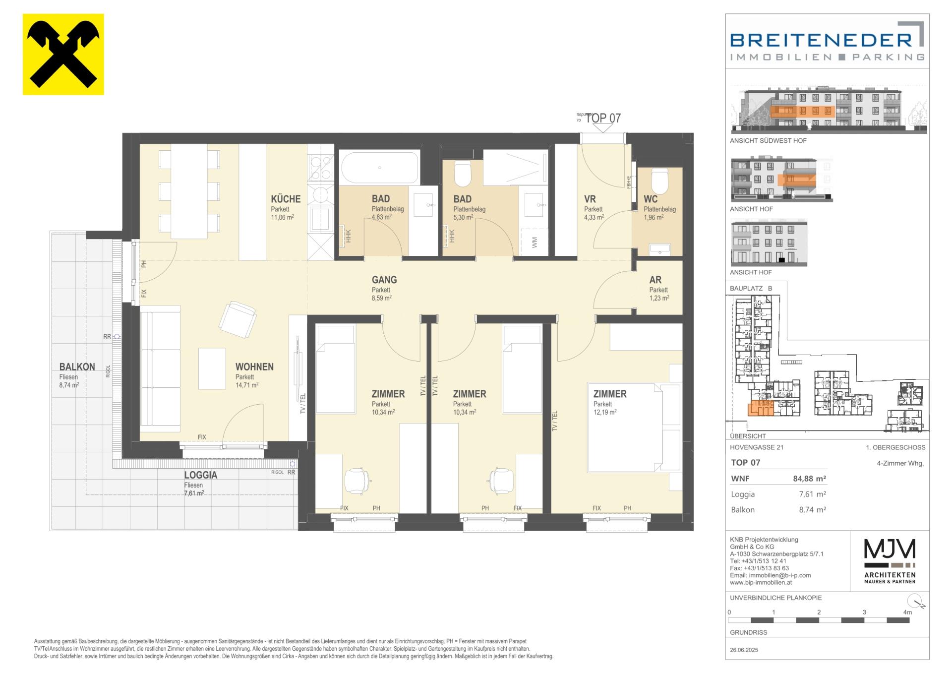 Kostentransparenz : Die ausgewiesenen Preise verstehen sich als Gesamtfixkaufpreise exklusive aller gesetzlichen Nebenkosten. Dazu zählen 3,5% Grunderwerbsteuer und 1,1% Grundbucheintragungsgebühr vom Gesamt-Kaufpreis sowie das Treuhandentgelt inklusive Vertragserrichtungsentgelt in Höhe von 1,5% vom Gesamt-Kaufpreis (zzgl. USt und Barauslagen). Für den Hauptwohnsitzerwerb in einem neu erworbenen Eigenheim entfallen von Juli 2024 bis Juli 2026 die Grundbuch- und Pfandrechtseintragungsgebühren bis zu einem Wert von 500.000 Euro (für übersteigende Beträge ist die Gebühr zu entrichten).