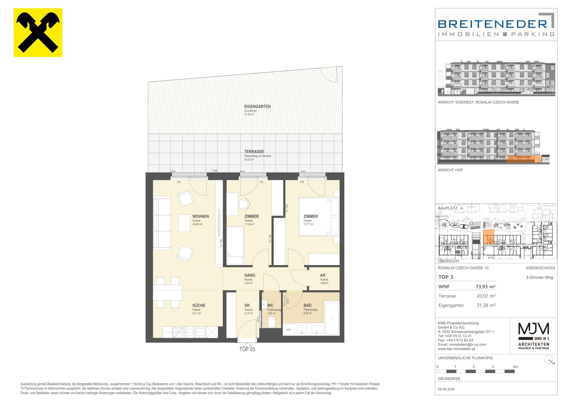 Die Preise verstehen sich als Nettokaufpreise zzgl. USt. Hinzu kommen 3,5 % Grunderwerbsteuer, 1,1 % Grundbucheintragungsgebühr sowie ein Treuhand- und Vertragserrichtungsentgelt von 1,5 % des Gesamtkaufpreises (zzgl. USt und Barauslagen).