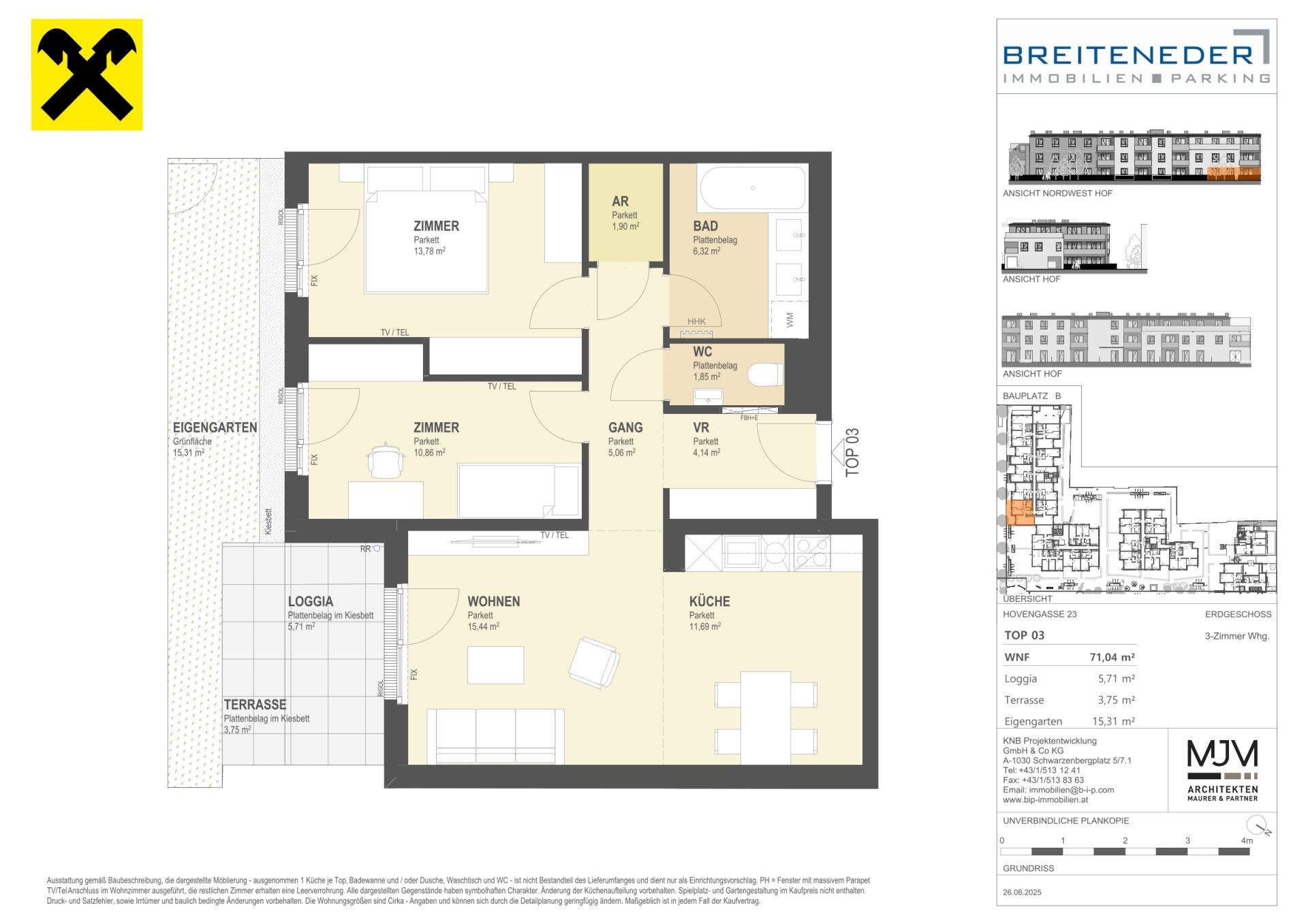 Die Preise verstehen sich als Nettokaufpreise zzgl. USt. Hinzu kommen 3,5 % Grunderwerbsteuer, 1,1 % Grundbucheintragungsgebühr sowie ein Treuhand- und Vertragserrichtungsentgelt von 1,5 % des Gesamtkaufpreises (zzgl. USt und Barauslagen).