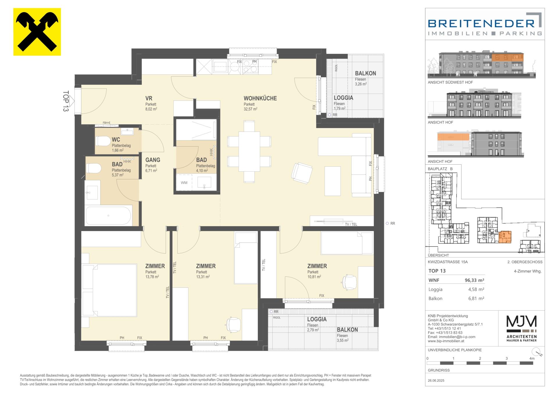 Das Projekt setzt auf zukunftsorientierte Energieeffizienz: Fernwärme, die Vorbereitung für Photovoltaik-Anlagen sowie E-Ladestationen sind Teil des Konzepts. Ein angestrebtes klima.aktiv-Zertifikat unterstreicht den nachhaltigen Anspruch. Hochwertige Materialien wie Eichenparkett, 3-fach-verglaste Fenster und Küchen mit Miele-Geräten schaffen ein Wohnumfeld, das heute begeistert und morgen Bestand hat.