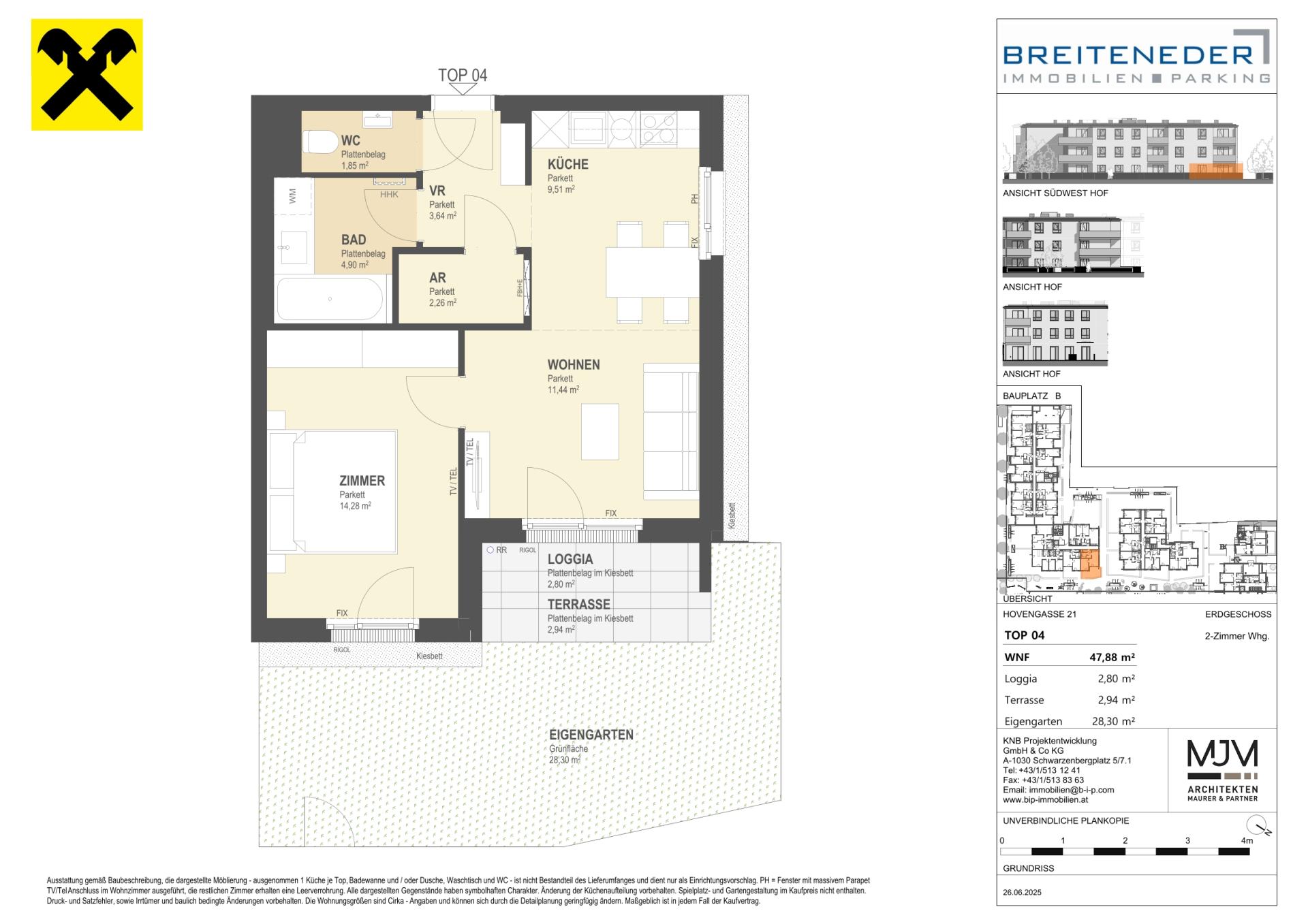 Die Preise verstehen sich als Nettokaufpreise zzgl. USt. Hinzu kommen 3,5 % Grunderwerbsteuer, 1,1 % Grundbucheintragungsgebühr sowie ein Treuhand- und Vertragserrichtungsentgelt von 1,5 % des Gesamtkaufpreises (zzgl. USt und Barauslagen).