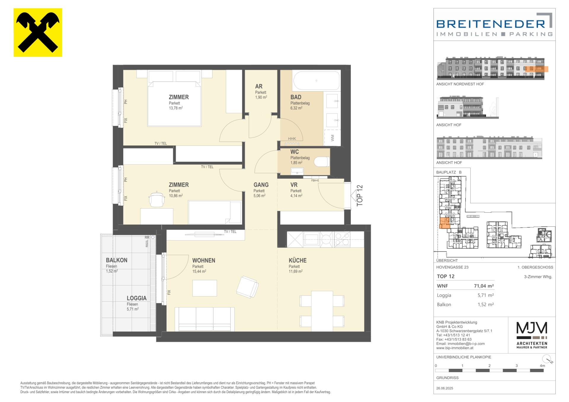 Kostentransparenz : Die ausgewiesenen Preise verstehen sich als Gesamtfixkaufpreise exklusive aller gesetzlichen Nebenkosten. Dazu zählen 3,5% Grunderwerbsteuer und 1,1% Grundbucheintragungsgebühr vom Gesamt-Kaufpreis sowie das Treuhandentgelt inklusive Vertragserrichtungsentgelt in Höhe von 1,5% vom Gesamt-Kaufpreis (zzgl. USt und Barauslagen). Für den Hauptwohnsitzerwerb in einem neu erworbenen Eigenheim entfallen von Juli 2024 bis Juli 2026 die Grundbuch- und Pfandrechtseintragungsgebühren bis zu einem Wert von 500.000 Euro (für übersteigende Beträge ist die Gebühr zu entrichten).