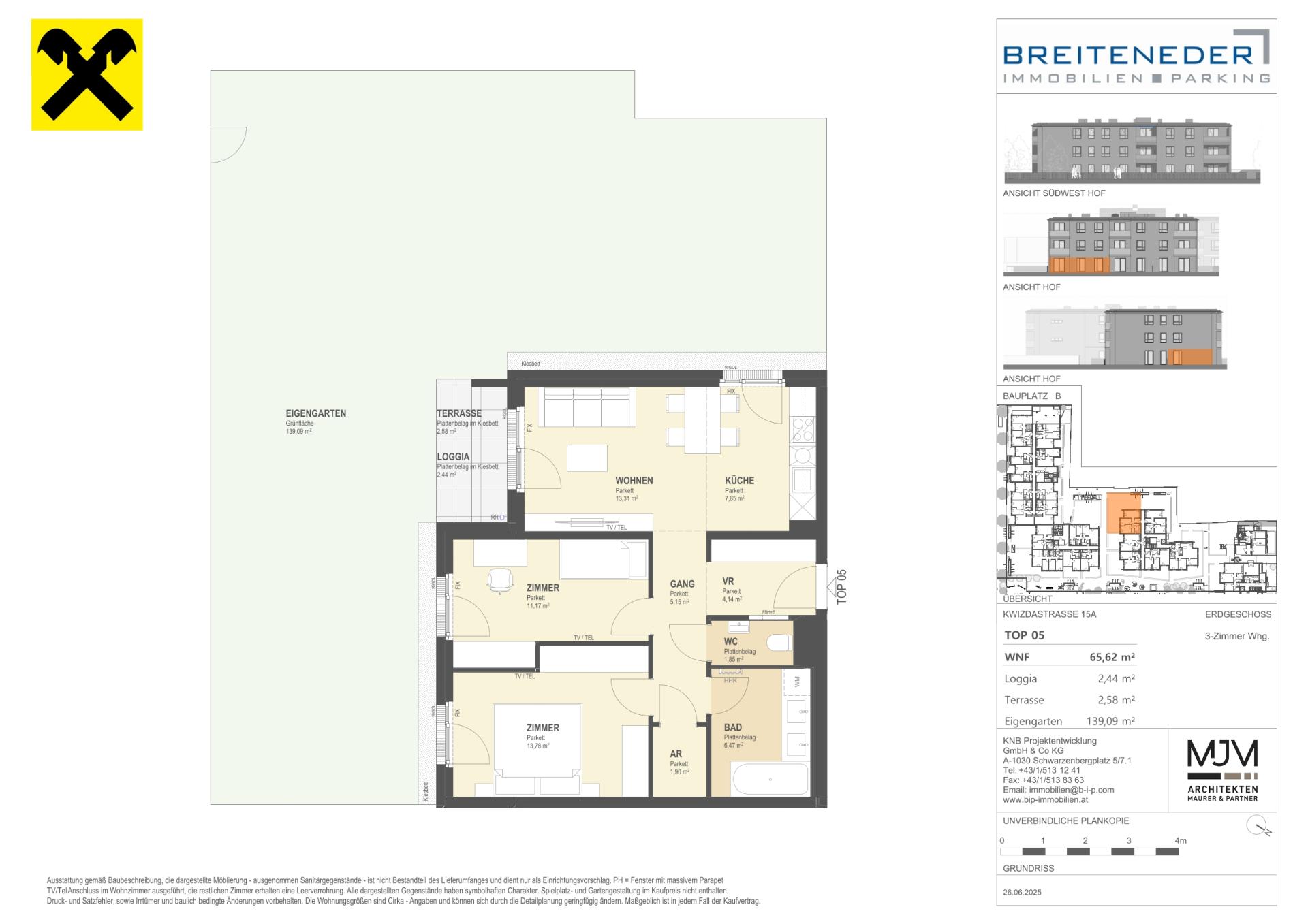Kostentransparenz : Die ausgewiesenen Preise verstehen sich als Gesamtfixkaufpreise exklusive aller gesetzlichen Nebenkosten. Dazu zählen 3,5% Grunderwerbsteuer und 1,1% Grundbucheintragungsgebühr vom Gesamt-Kaufpreis sowie das Treuhandentgelt inklusive Vertragserrichtungsentgelt in Höhe von 1,5% vom Gesamt-Kaufpreis (zzgl. USt und Barauslagen). Für den Hauptwohnsitzerwerb in einem neu erworbenen Eigenheim entfallen von Juli 2024 bis Juli 2026 die Grundbuch- und Pfandrechtseintragungsgebühren bis zu einem Wert von 500.000 Euro (für übersteigende Beträge ist die Gebühr zu entrichten).