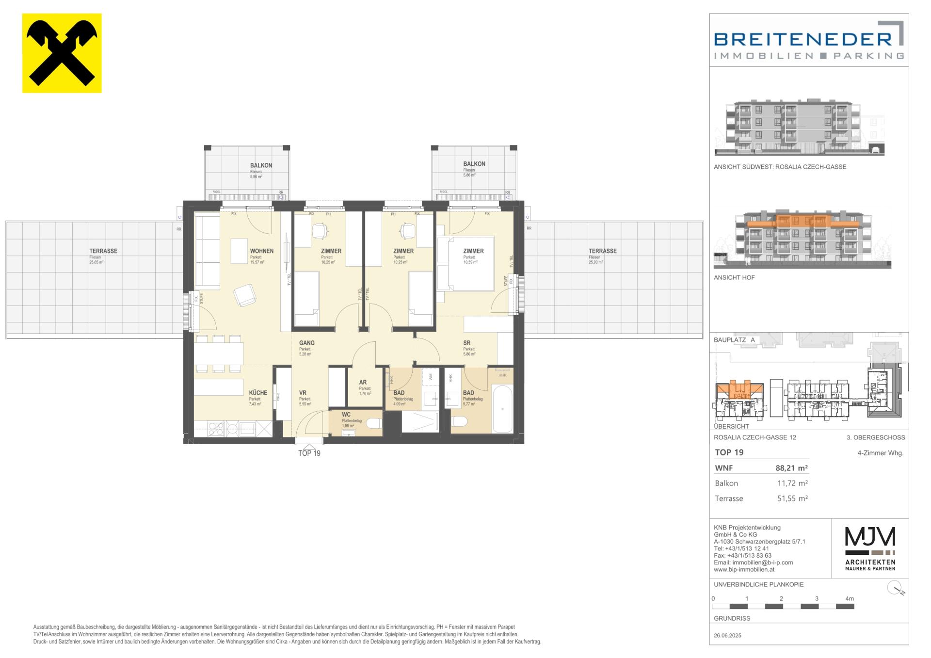 Kostentransparenz : Die ausgewiesenen Preise verstehen sich als Gesamtfixkaufpreise exklusive aller gesetzlichen Nebenkosten. Dazu zählen 3,5% Grunderwerbsteuer und 1,1% Grundbucheintragungsgebühr vom Gesamt-Kaufpreis sowie das Treuhandentgelt inklusive Vertragserrichtungsentgelt in Höhe von 1,5% vom Gesamt-Kaufpreis (zzgl. USt und Barauslagen). Für den Hauptwohnsitzerwerb in einem neu erworbenen Eigenheim entfallen von Juli 2024 bis Juli 2026 die Grundbuch- und Pfandrechtseintragungsgebühren bis zu einem Wert von 500.000 Euro (für übersteigende Beträge ist die Gebühr zu entrichten).