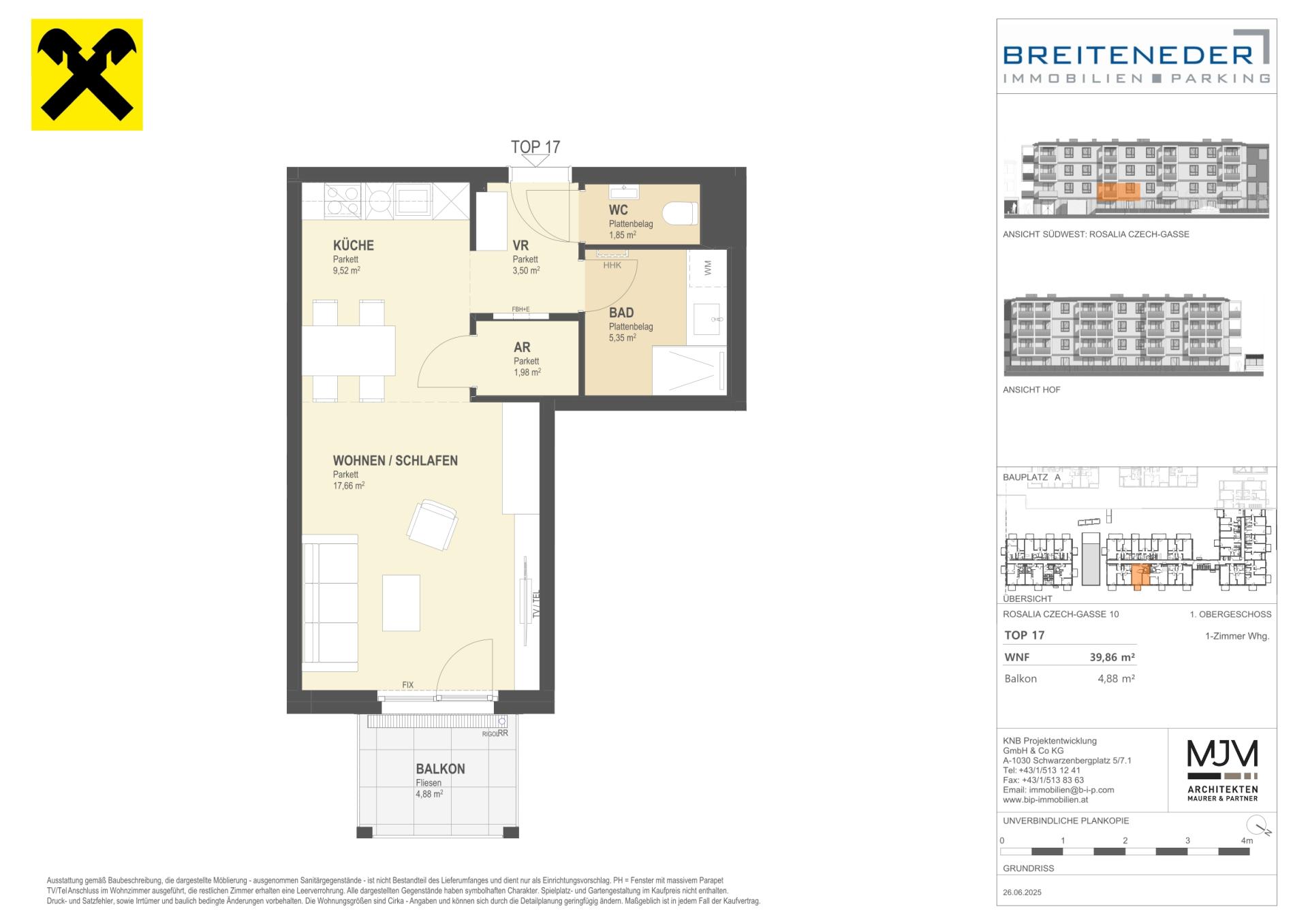 Die Preise verstehen sich als Nettokaufpreise zzgl. USt. Hinzu kommen 3,5 % Grunderwerbsteuer, 1,1 % Grundbucheintragungsgebühr sowie ein Treuhand- und Vertragserrichtungsentgelt von 1,5 % des Gesamtkaufpreises (zzgl. USt und Barauslagen).