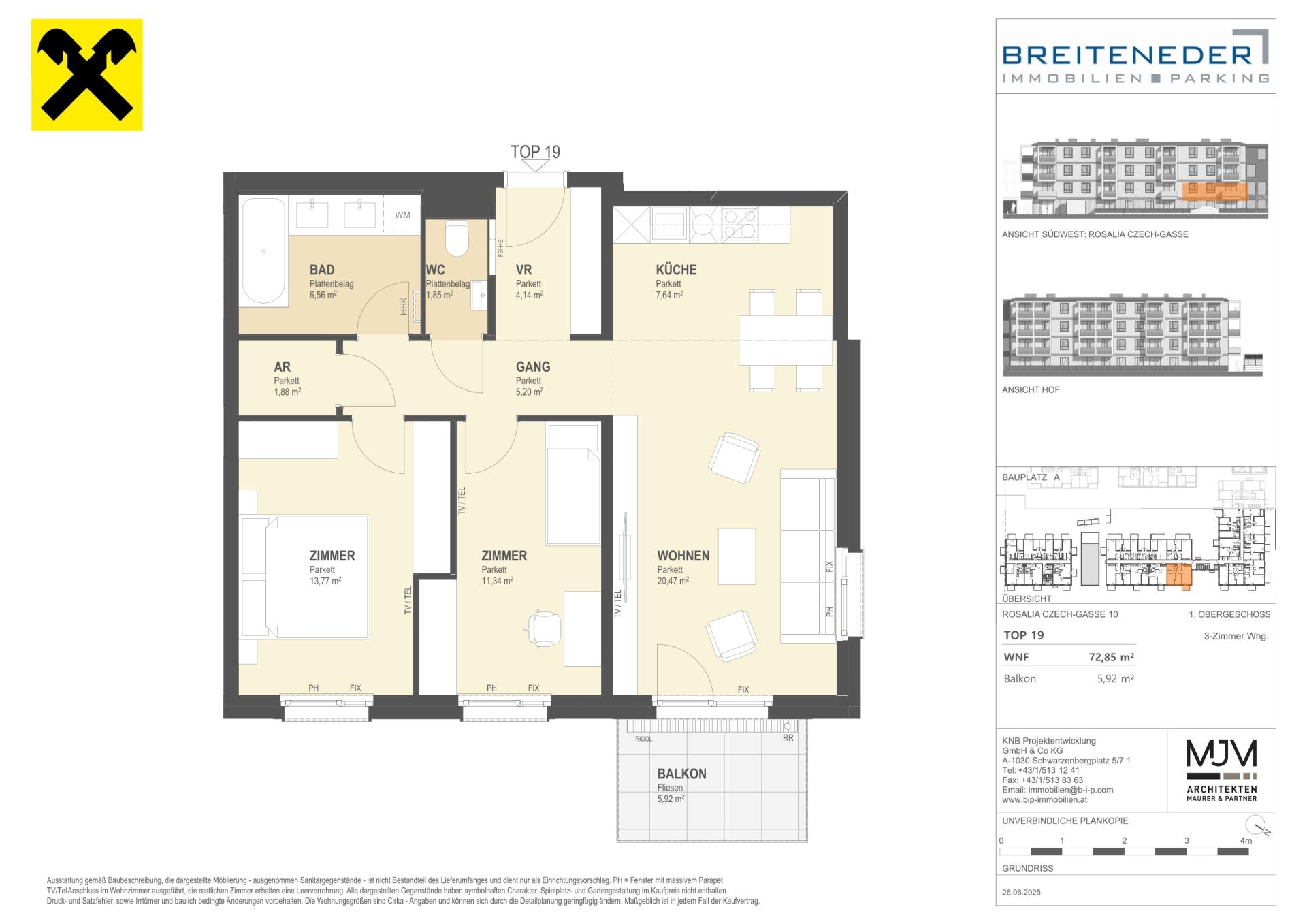 Die Preise verstehen sich als Nettokaufpreise zzgl. USt. Hinzu kommen 3,5 % Grunderwerbsteuer, 1,1 % Grundbucheintragungsgebühr sowie ein Treuhand- und Vertragserrichtungsentgelt von 1,5 % des Gesamtkaufpreises (zzgl. USt und Barauslagen).