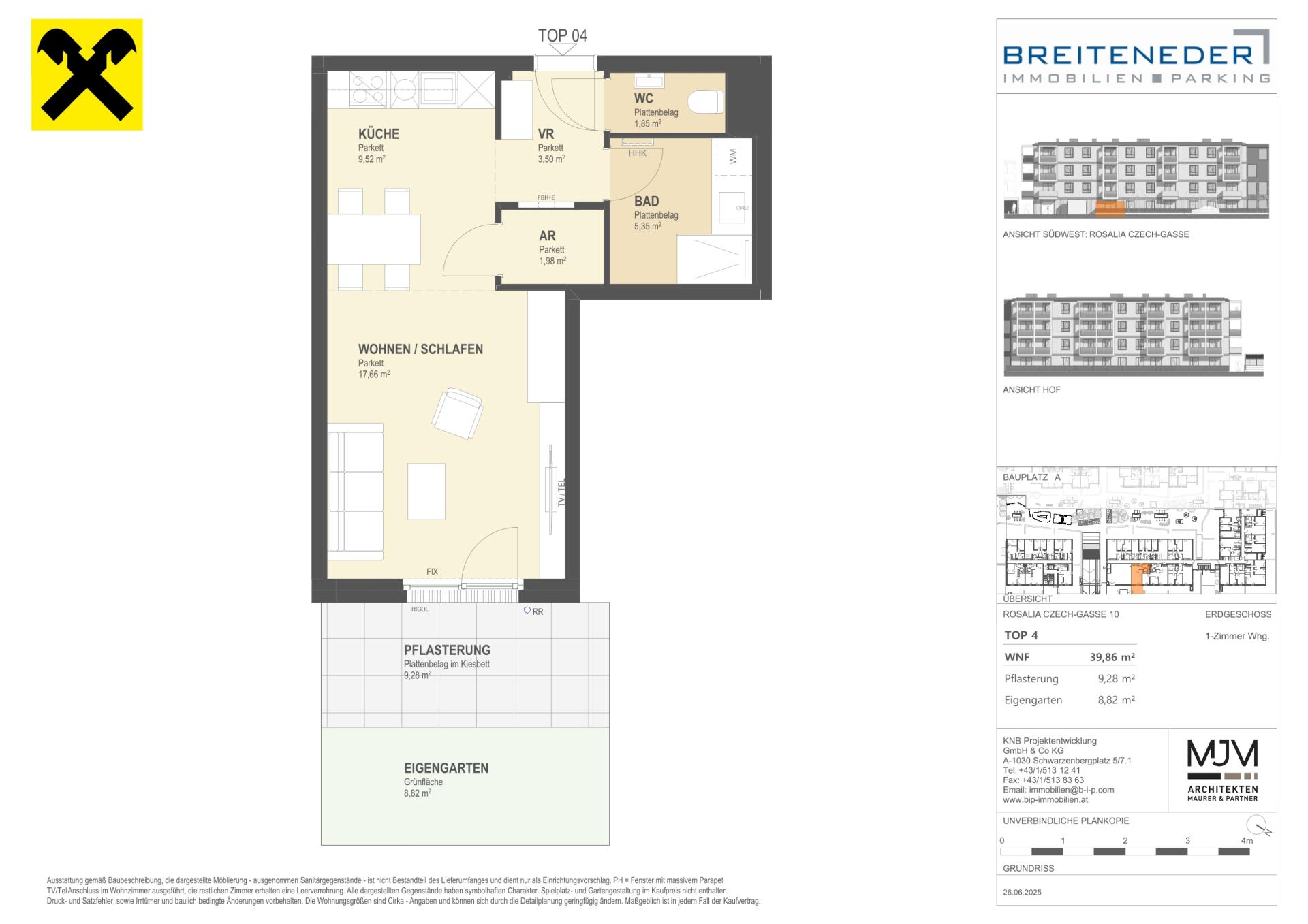Die Preise verstehen sich als Nettokaufpreise zzgl. USt. Hinzu kommen 3,5 % Grunderwerbsteuer, 1,1 % Grundbucheintragungsgebühr sowie ein Treuhand- und Vertragserrichtungsentgelt von 1,5 % des Gesamtkaufpreises (zzgl. USt und Barauslagen).