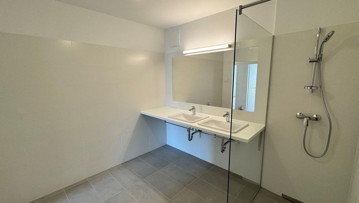 Das Badezimmer ist hochwertig mit einer "walk-in Dusche" ebenerdig verfliest und mit einem Doppelwaschbecken , sowie Spiegel, Handtuchtrockner und einem Waschmaschinenanschluss versehen.