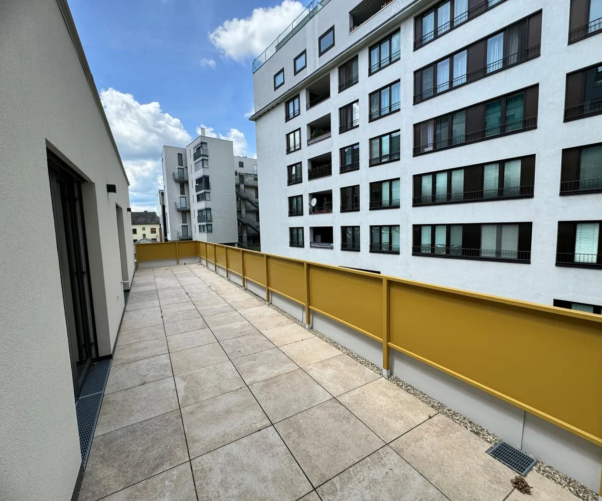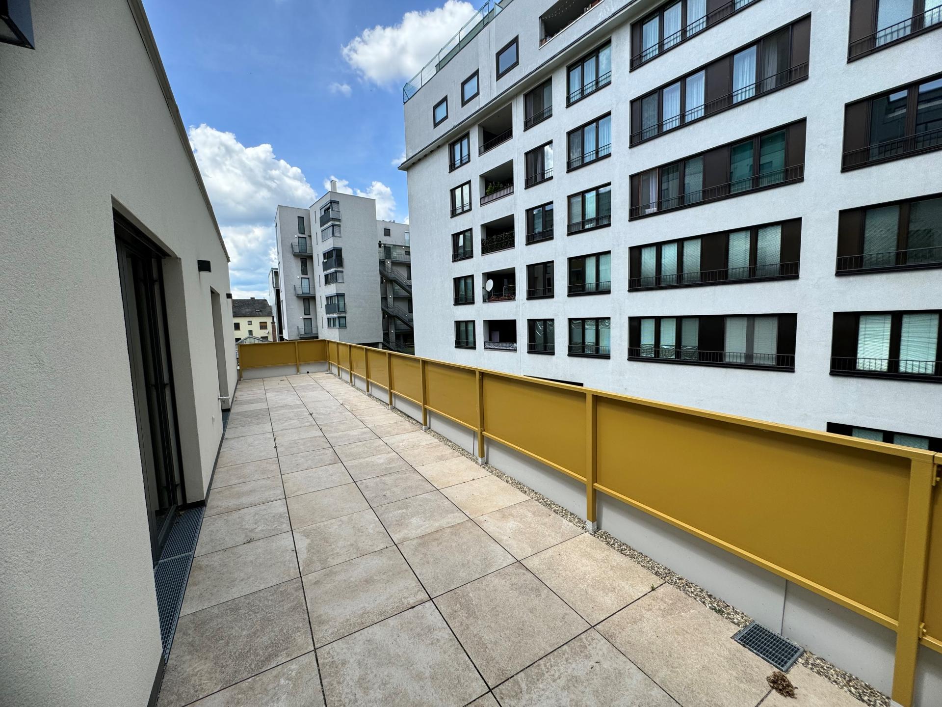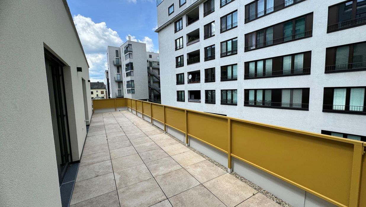 Die Wohnung ergänzt nutzt die Fläche des gesamten Stockwerks und erstreckt sich neben der Wohnfläche auch über 3 separaten Terrassen, welche nord-, ost- und südseitig befinden und mit Feinsteinzeugfliesen und Wasser-/Stromanschlüssen ausgestattet sind.