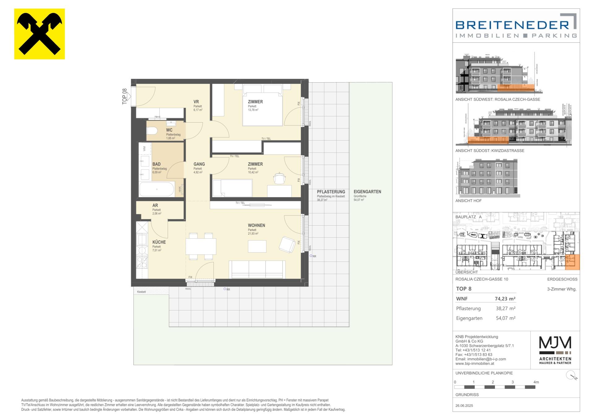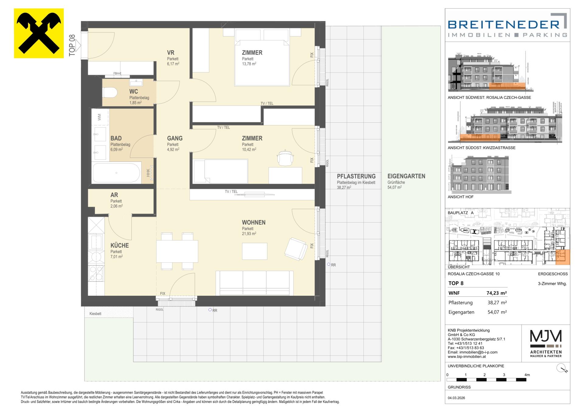 Die Preise verstehen sich als Nettokaufpreise zzgl. USt. Hinzu kommen 3,5 % Grunderwerbsteuer, 1,1 % Grundbucheintragungsgebühr sowie ein Treuhand- und Vertragserrichtungsentgelt von 1,5 % des Gesamtkaufpreises (zzgl. USt und Barauslagen).