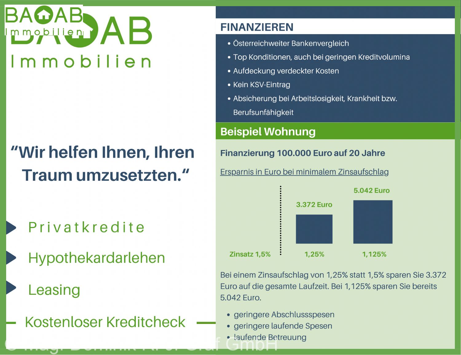 Bei jedem Kauf einer Immobilie oder eines Grundstücks ist es wichtig, die passende Finanzierung zu finden. Mit seiner eigenen Vertriebsorganisation ist Infina als Wohnbau-Finanz-Experte an über 100 Standorten in ganz Österreich vertreten und vermittelt Finanzierungen an über 150 Banken und Bausparkassen. Nutzen Sie unseren kostenlosen Kreditvergleich für den passenden Wohnkredit: