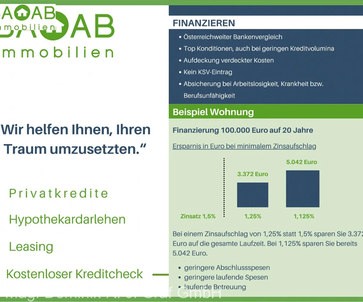 *Der Vertrag kommt nicht mit der INFINA Credit Broker GmbH zustande. Das Objekt wird von einem externen Immobilienunternehmen angeboten. Allfällige aus dem Vertragsabschluss resultierende Rechte sind ausschließlich gegenüber dem anbietenden Immobilienunternehmen geltend zu machen. Wir weisen Sie darauf hin, dass die gemachten Angaben und Informationen lediglich unverbindliche Vorabinformationen sind und daher ohne Gewähr erfolgen. Der Immobilienmakler erklärt, dass er – entgegen dem in der Immobilienwirtschaft üblichen Geschäftsgebrauch des Doppelmaklers – einseitig nur für den Vermieter tätig ist.
