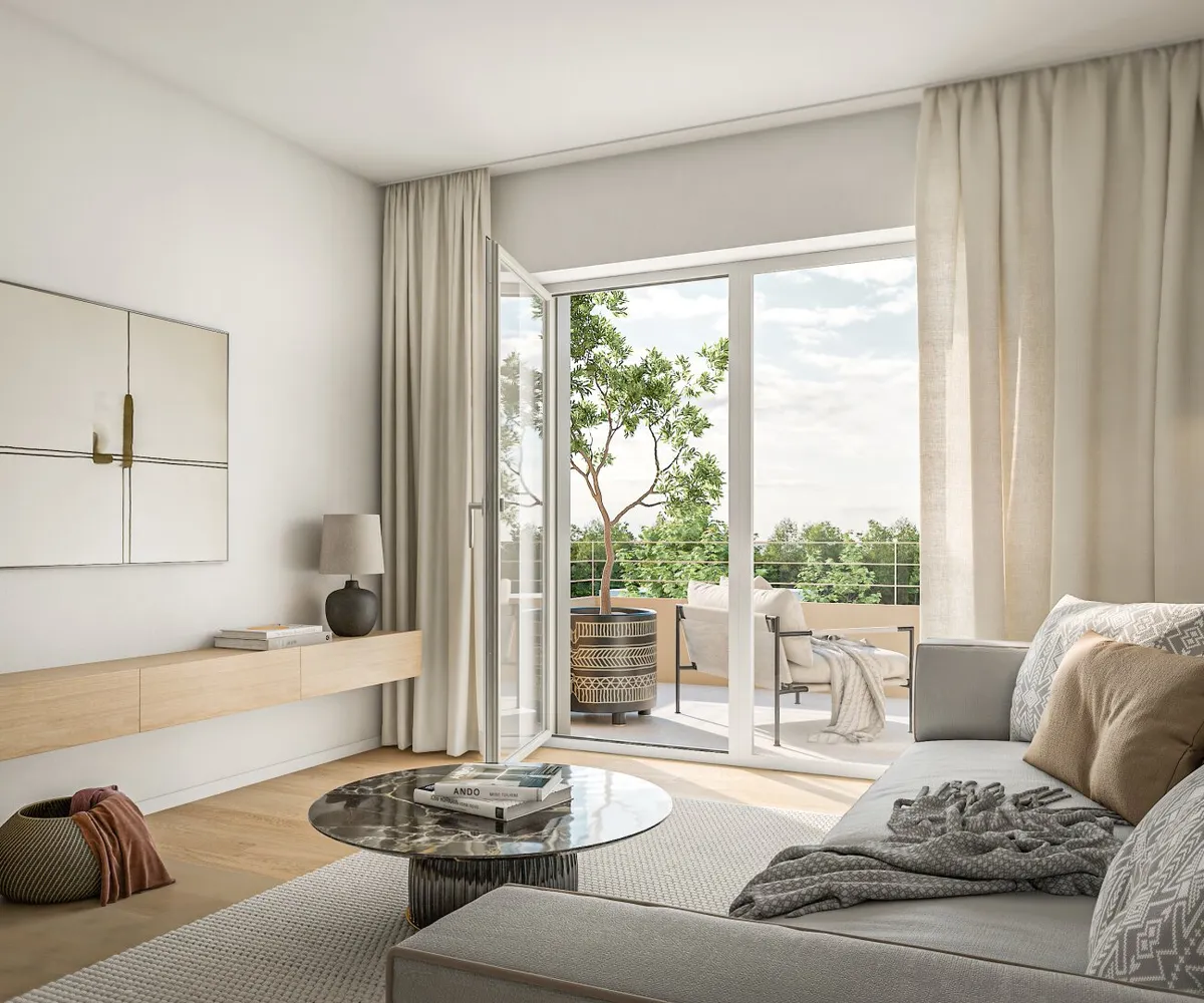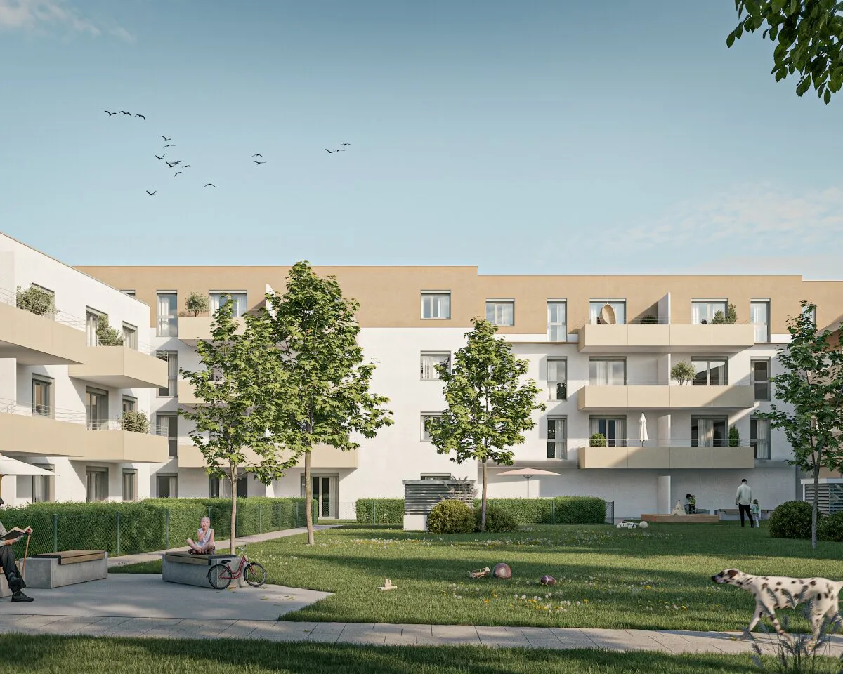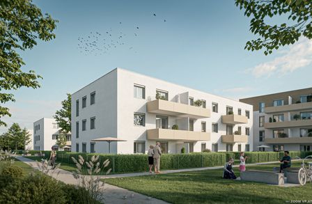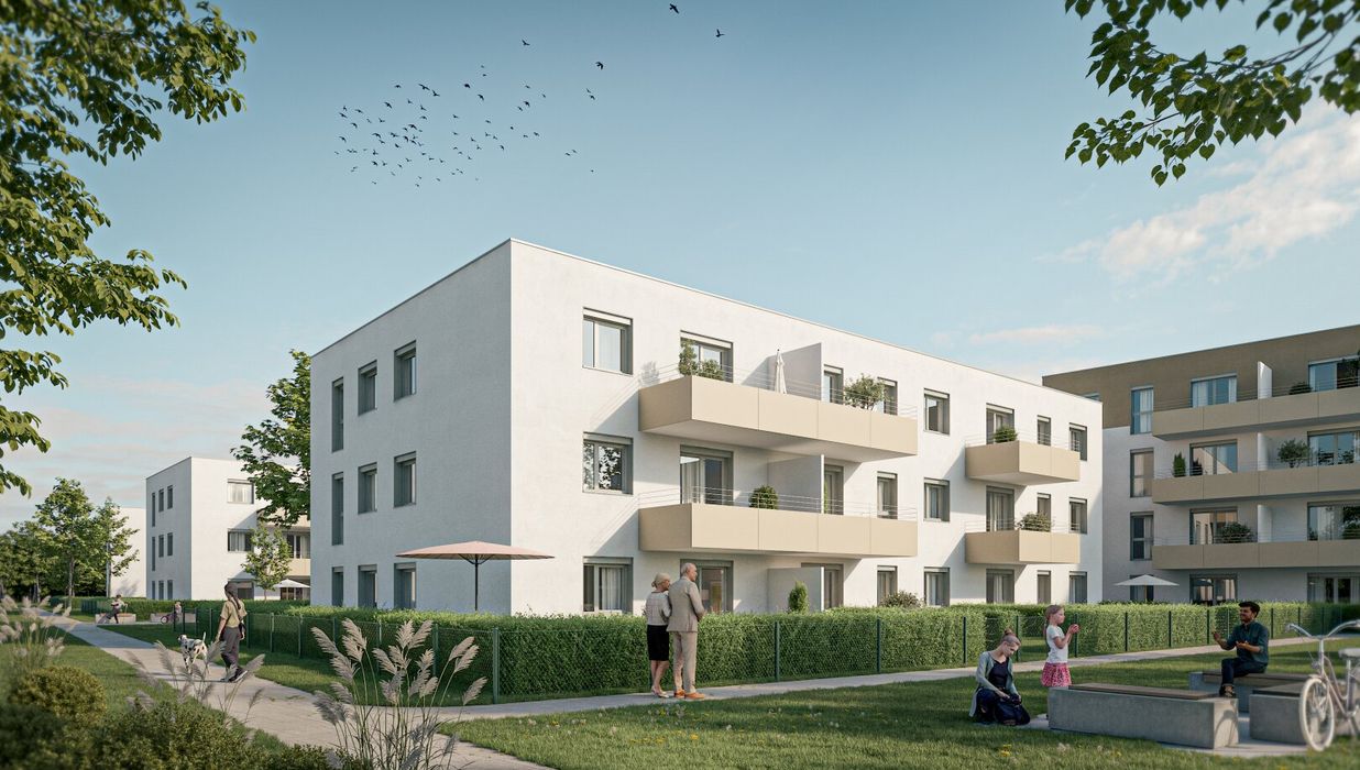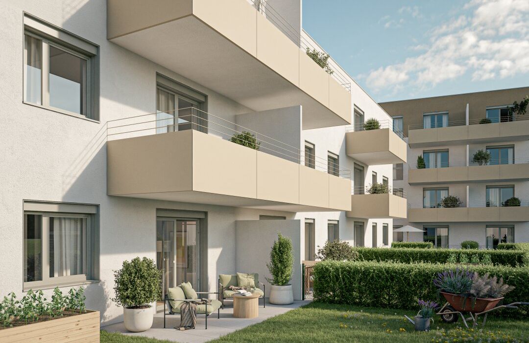 Der Baubeginn ist für Ende 2025 geplant, die Fertigstellung rund 20 Monate später. Auf einer Gesamtnutzfläche von 4.940 Quadratmetern entstehen 73 Wohnungen mit ein bis vier Zimmern. Alle Einheiten verfügen über großzügige Freiflächen: Balkone in den Obergeschossen sowie Terrassen und Gärten im Erdgeschoss. Darüber hinaus stehen 73 Tiefgaragenplätze und 37 Stellplätze im Freien zur Verfügung. Jede Wohnung erhält einen eigenen Einlagerungsraum im Untergeschoss. Gebaut wird in massiver Stahlbetonweise. Die Beheizung erfolgt mittels Fernwärme über ein Speicherladesystem mit Fußbodenheizung. Zur Ausstattung zählen Keramikfliesen, moderne Vinylböden, Kunststofffenster mit Dreifach-Isolierverglasung sowie Alu-Außenrollläden in allen Geschossen.