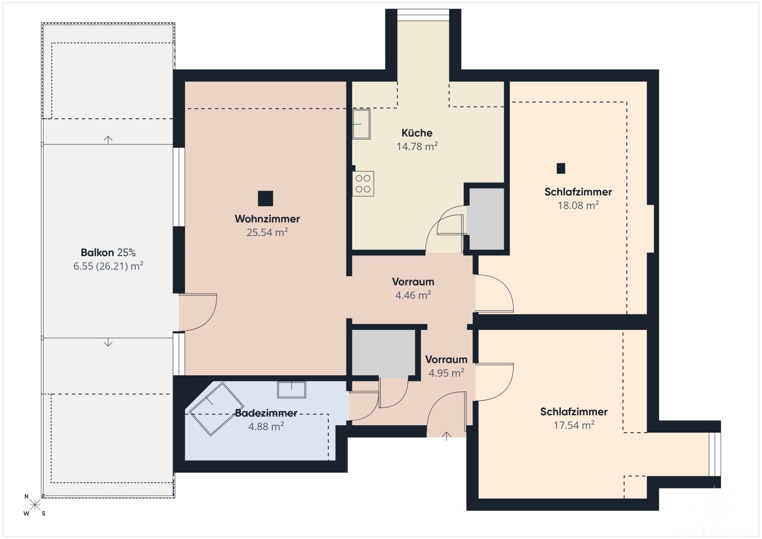 Extras: Separates WC, praktischer Abstellraum direkt in der Wohnung. Ein eigenes Kellerabteil (ca. 6 m²).