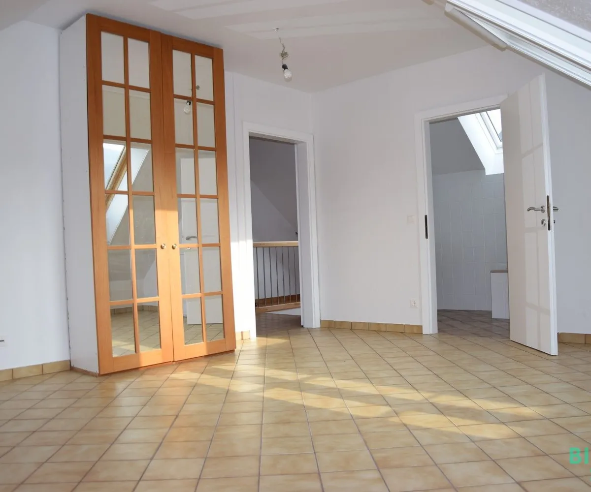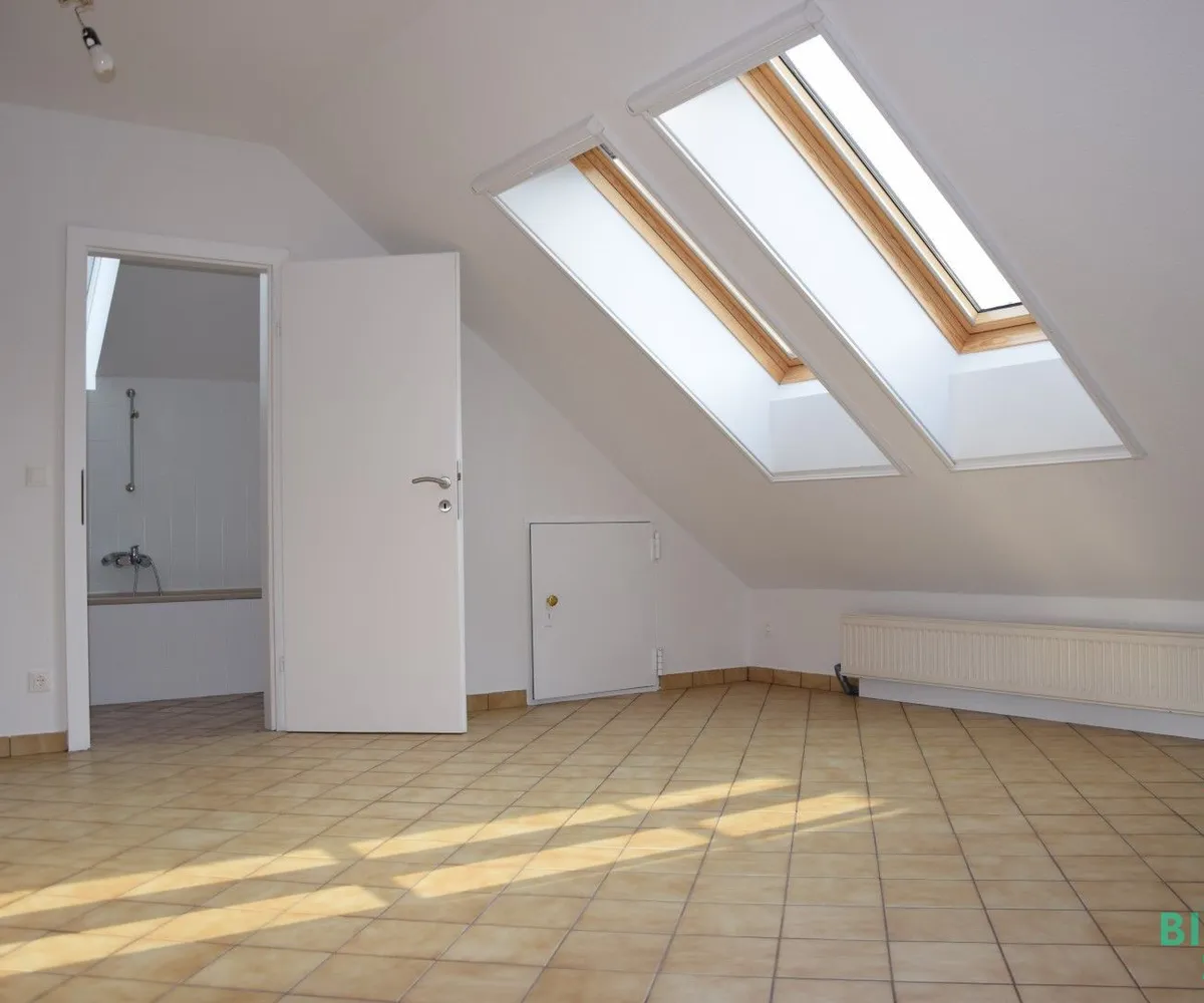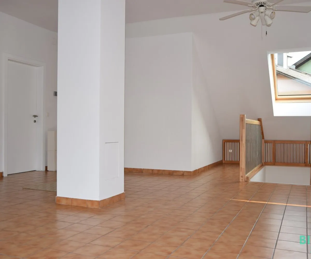 Die schöne Holzstiege führt in das loftartige Obergeschoss, das mit einem großzügigen Wohn-/Essbereich mit Küche, ein großes Zimmer mit angrenzendem Bad und einem separaten WC ausgestattet ist.