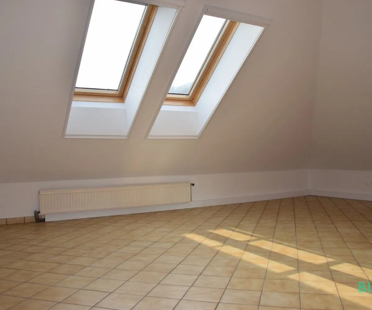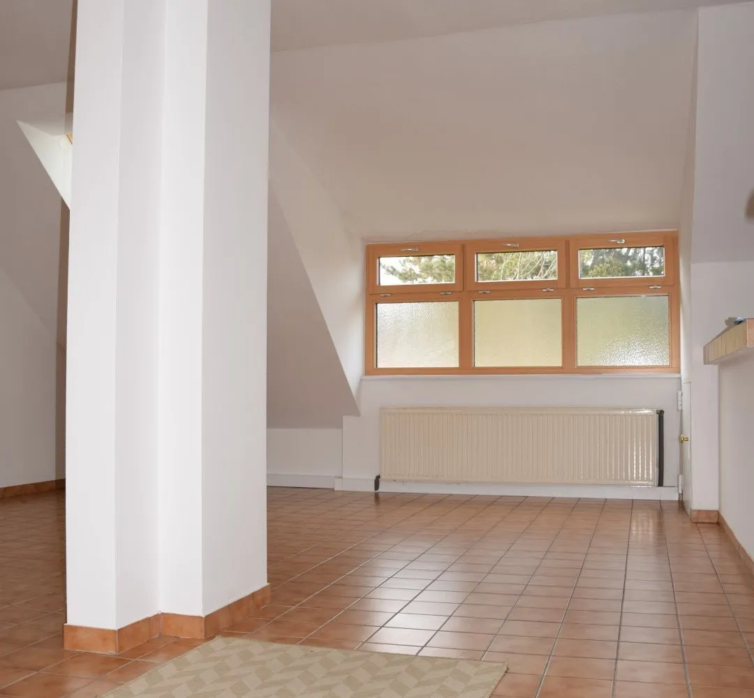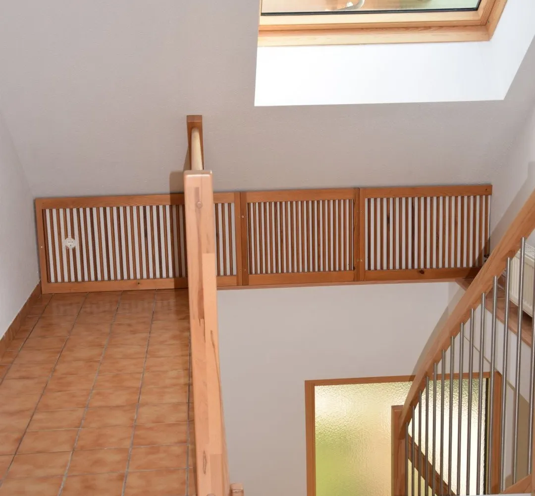 Die schöne Holzstiege führt in das loftartige Obergeschoss, das mit einem großzügigen Wohn-/Essbereich mit Küche, ein großes Zimmer mit angrenzendem Bad und einem separaten WC ausgestattet ist.