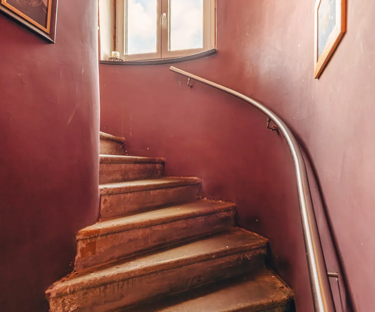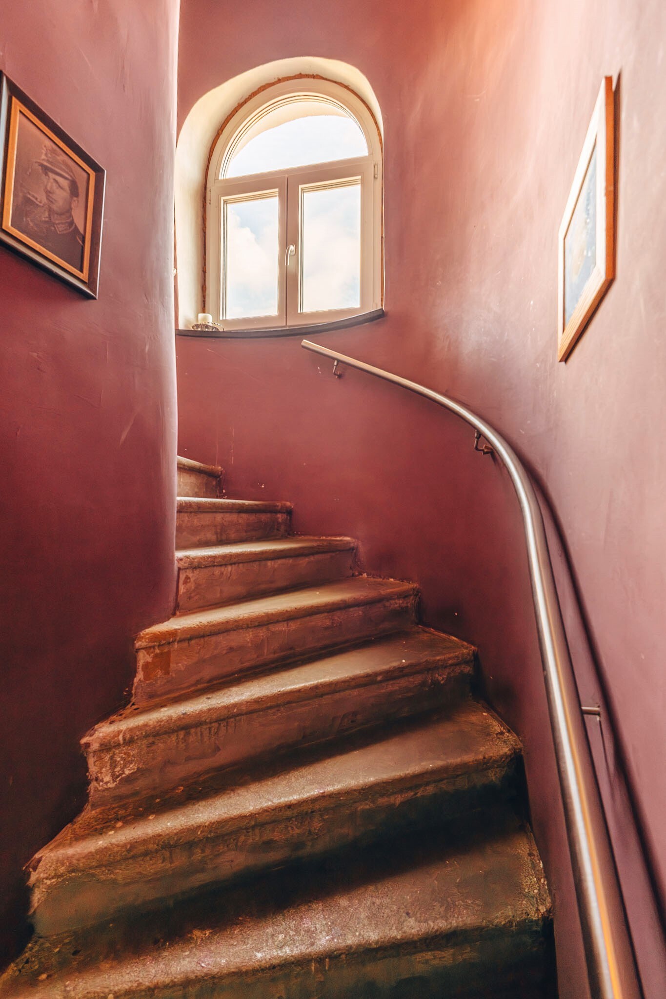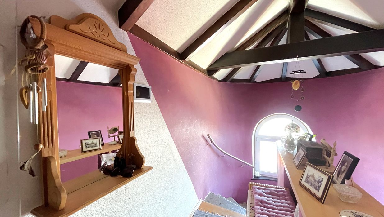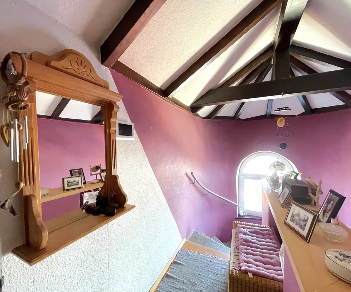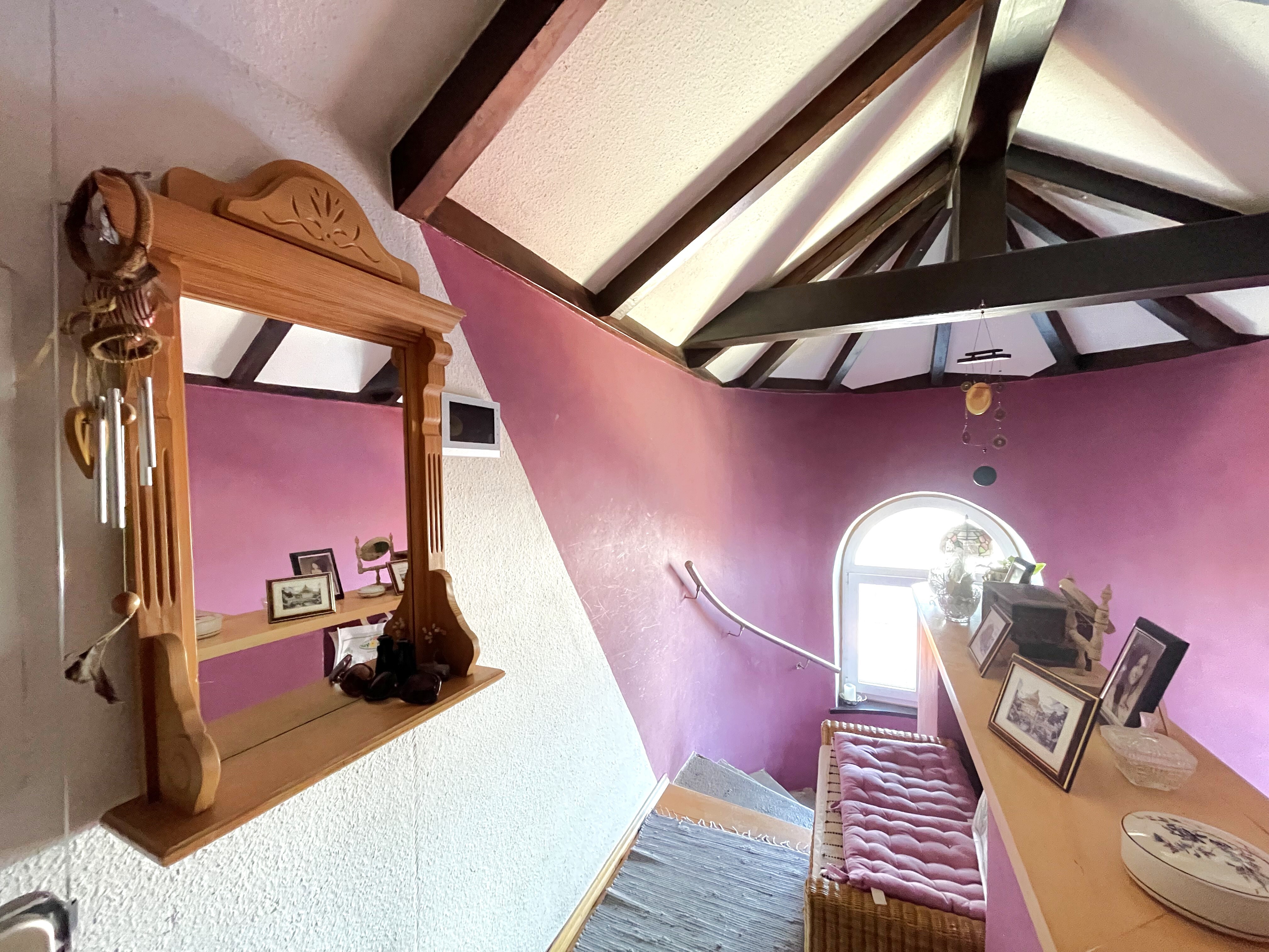 Der Zugang zur Wohnung befindet sich im darunterliegenden Geschoss des Stiegenhauses und führt zunächst in den Vorraum, von dem aus der private Stiegenaufgang zur Dachgeschoss-Wohnfläche beginnt. Von dort gelangt man über einen charaktervollen Stiegenaufgang mit massiven Steinstufen zur Wohnfläche im Dachgeschoss. Sichtbare Holzträger der Dachkonstruktion und ein Rundbogenfenster verleihen diesem Bereich eine besondere Atmosphäre und unterstreichen den individuellen Charakter der Wohnung. Im Dachgeschoss angekommen befindet sich die Wohnfläche mit einer großzügigen Raumaufteilung .