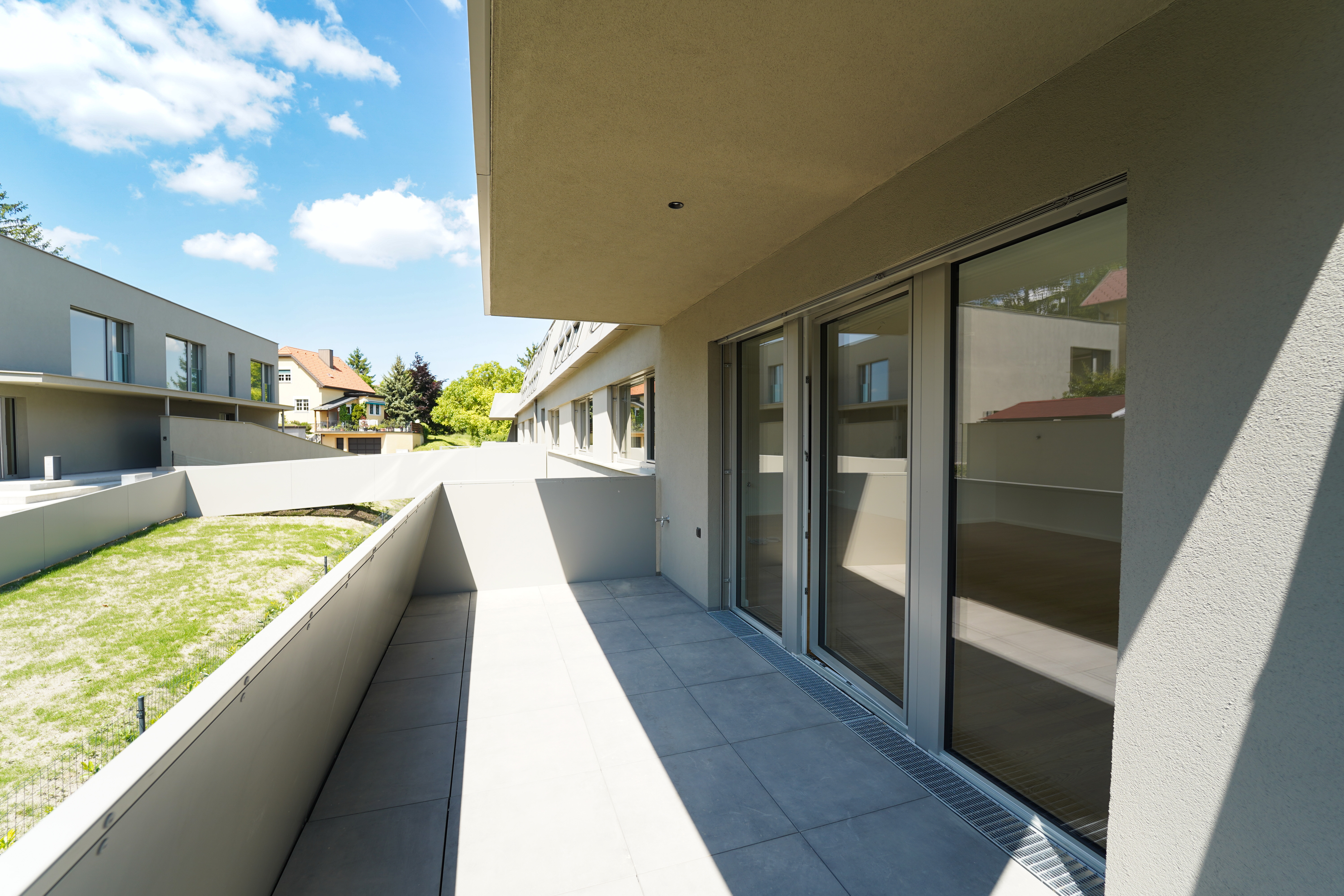 Das Projekt bietet nicht nur architektonische Eleganz, sondern setzt auch in puncto Ausstattung höchste Standards. Große Fenster mit Dreifachverglasung sorgen für lichtdurchflutete Räume und eine angenehme Wohnatmosphäre. Raffstores bieten flexiblen Sonnenschutz und Privatsphäre. Edle Parkettböden in den Wohnräumen und moderne Feinsteinzeugfliesen in den Bädern unterstreichen den hohen Komfort. Eine innovative Haustechnik mit Luftwärmepumpe und Fußbodenheizung sorgt für angenehme Temperaturen zu jeder Jahreszeit.