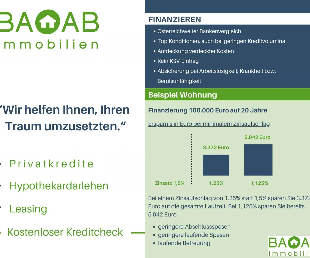 *Der Vertrag kommt nicht mit der INFINA Credit Broker GmbH zustande. Das Objekt wird von einem externen Immobilienunternehmen angeboten. Allfällige aus dem Vertragsabschluss resultierende Rechte sind ausschließlich gegenüber dem anbietenden Immobilienunternehmen geltend zu machen. Wir weisen Sie darauf hin, dass die gemachten Angaben und Informationen lediglich unverbindliche Vorabinformationen sind und daher ohne Gewähr erfolgen. Der Vermittler ist als Doppelmakler tätig.