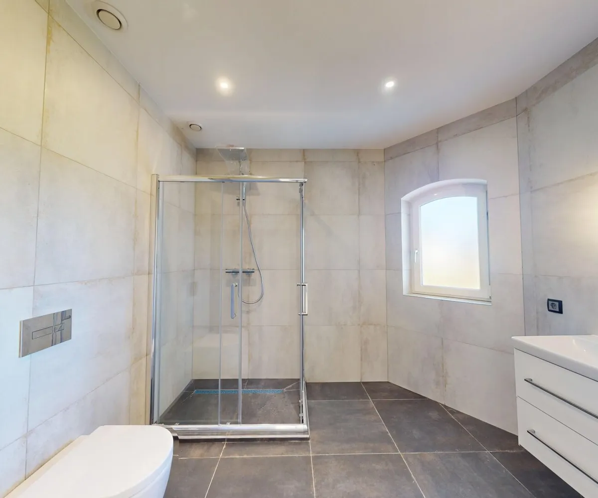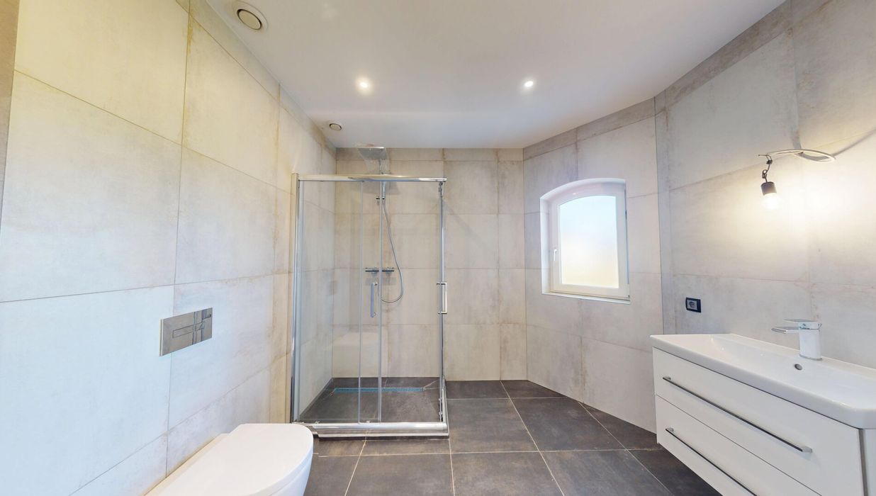 Das Raumangebot wird durch ein Badezimmer mit Dusche und WC sowie eine separate Toilette mit Dusche ergänzt. Direkt an das Badezimmer grenzt ein zusätzlicher Raum im ursprünglichen Zustand, der sich ideal als Badezimmererweiterung oder Saunabereich eignet.