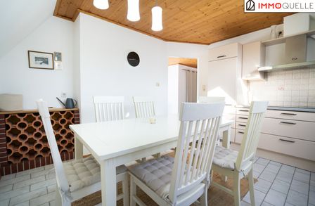 Auf der rechten Seite des Flurs befindet sich das Wohnzimmer, das durch seine Fensterform einen besonderen Charakter erhält - gleichzeitig aber hell und gemütlich bleibt. Von hier aus gelangen Sie in die getrennte Wohnküche, die als echter Lieblingsplatz überzeugt. Die stilvolle Einbauküche bietet Platz für einen großen Esstisch, während ein gemauerter Weinständer charmante Akzente setzt. Auch hier ist die südöstliche Ausrichtun g spürbar - zur Mittagszeit durchflutet die Sonne den Raum und verleiht ihm eine einladende Wärme.