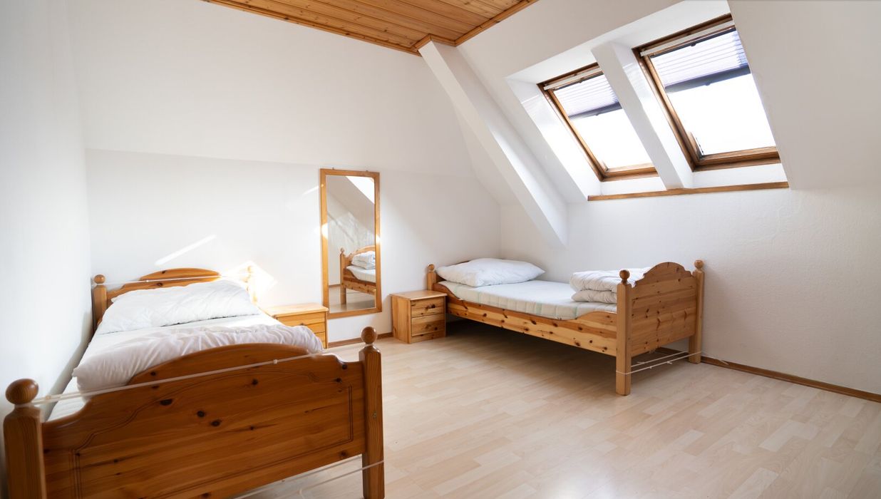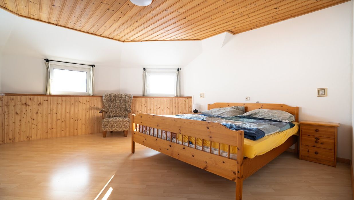 Vom Eingangsbereich aus gelangen Sie direkt in den ruhigen Rückzugsbereich der Wohnung: zwei helle Schlafzimmer, deren Fenster den Blick in die ruhige Umgebung freigeben. Das erste Zimmer misst etwa 14 m² und eignet sich ideal als Kinderzimmer, Gästezimmer oder Homeoffice. Direkt anschließend liegt das lichtdurchflutete Hauptschlafzimmer, das mit drei Fenstern und fast 22 m² Fläche beeindruckt. Durch die südöstliche Ausrichtung genießen beide Räume ab dem späten Vormittag ein angenehm warmes, sonniges Licht.
