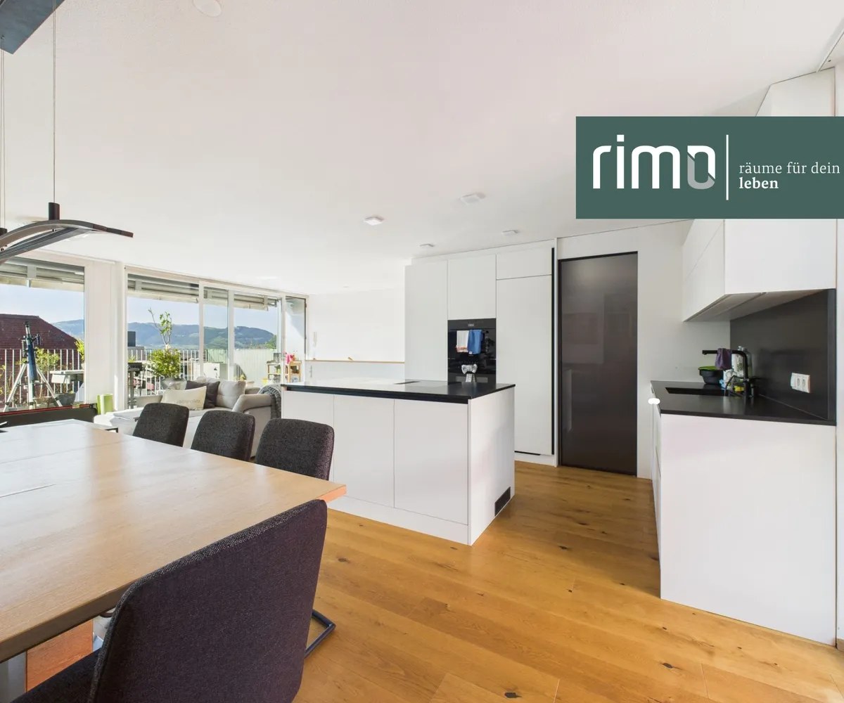 Genießen Sie die Vorzüge einer offenen Wohnküche, die nahtlos in den Wohnbereich übergeht und ein harmonisches Familienleben fördert. Die großen Fenster durchfluten die Räume mit natürlichem Licht und bieten Ihnen gleichzeitig einen atemberaubenden Ausblick auf die umliegenden Berge. Hier können Sie nach einem langen Tag entspannen und die Schönheit der Natur in vollen Zügen genießen.
