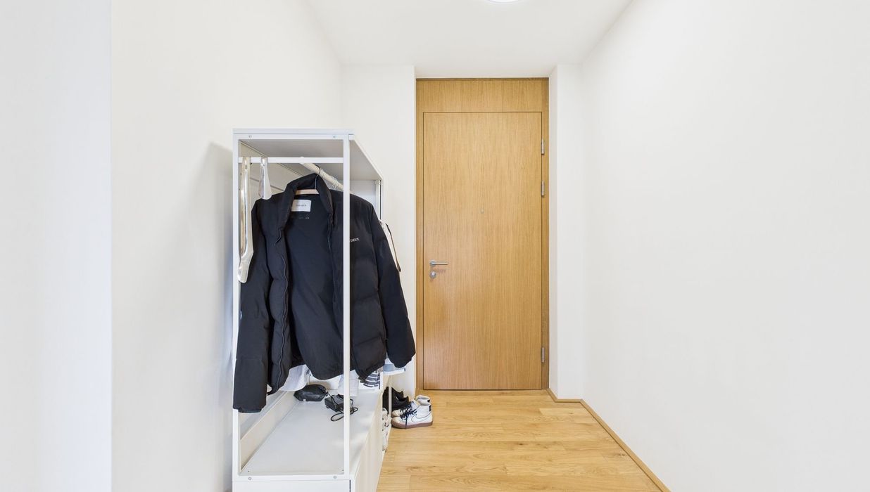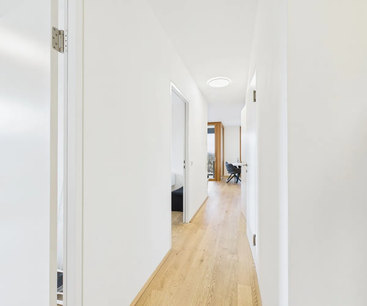 Edler Parkettboden in den Wohnräumen, zeitlose Fliesen im Badezimmer sowie große bodentiefe Fenster sorgen für ein helles, angenehmes Ankommen. Die eleganten Holz-Alu-Fenster unterstreichen den hochwertigen Charakter, während die Beschattung mittels Screens auf der Loggia für optimalen Komfort sorgt.