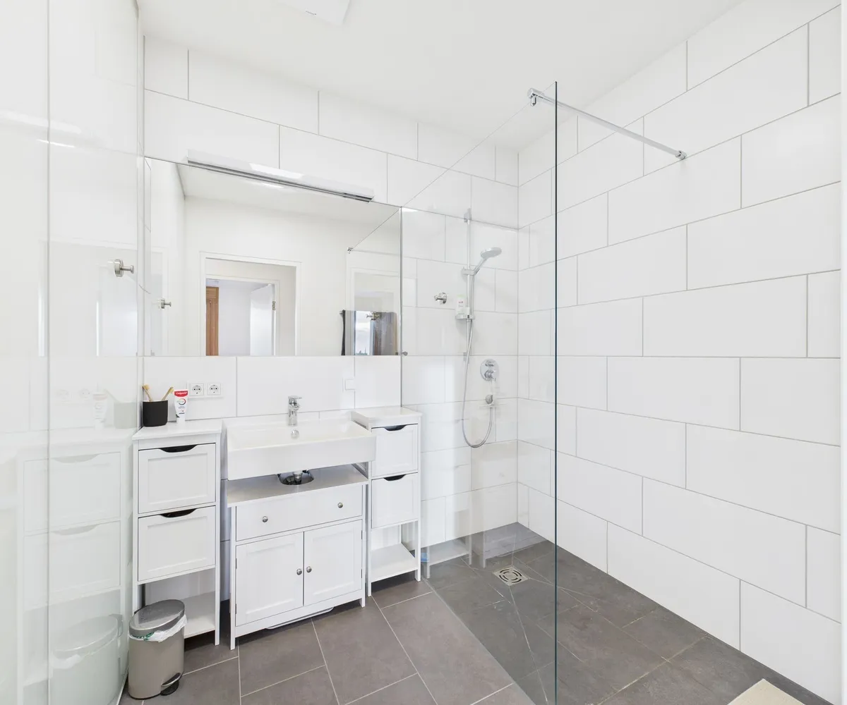 Die Ausstattung umfasst eine hochwertige Einbauküche, Fußbodenheizung mit Einzelraumsteuerung sowie ein stilvolles Badezimmer mit Walk-in-Dusche. Die überdachte Loggia lädt dazu ein, entspannte Stunden in der Abendsonne zu genießen.