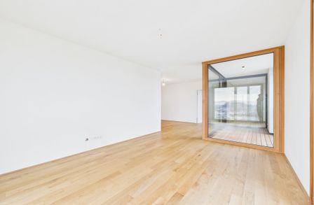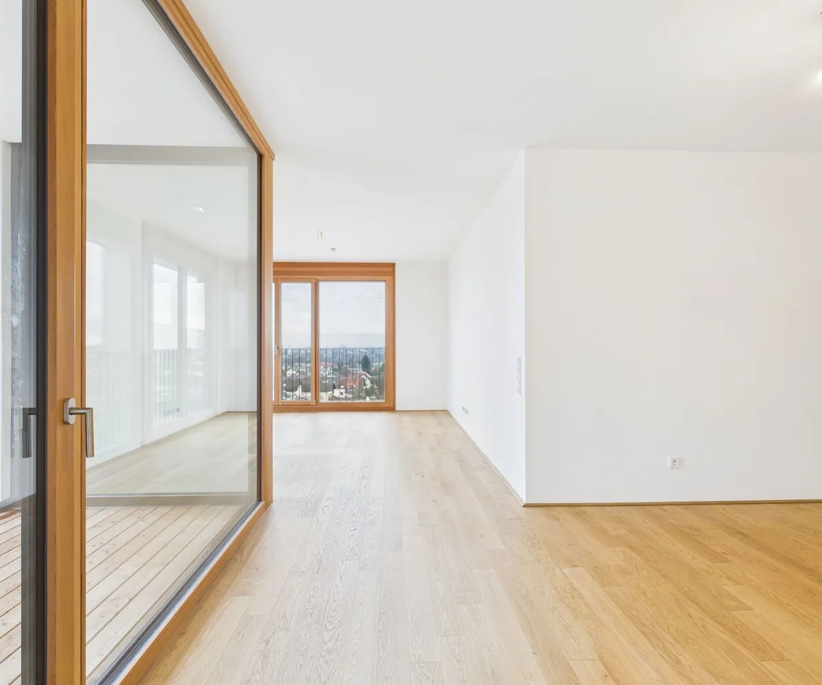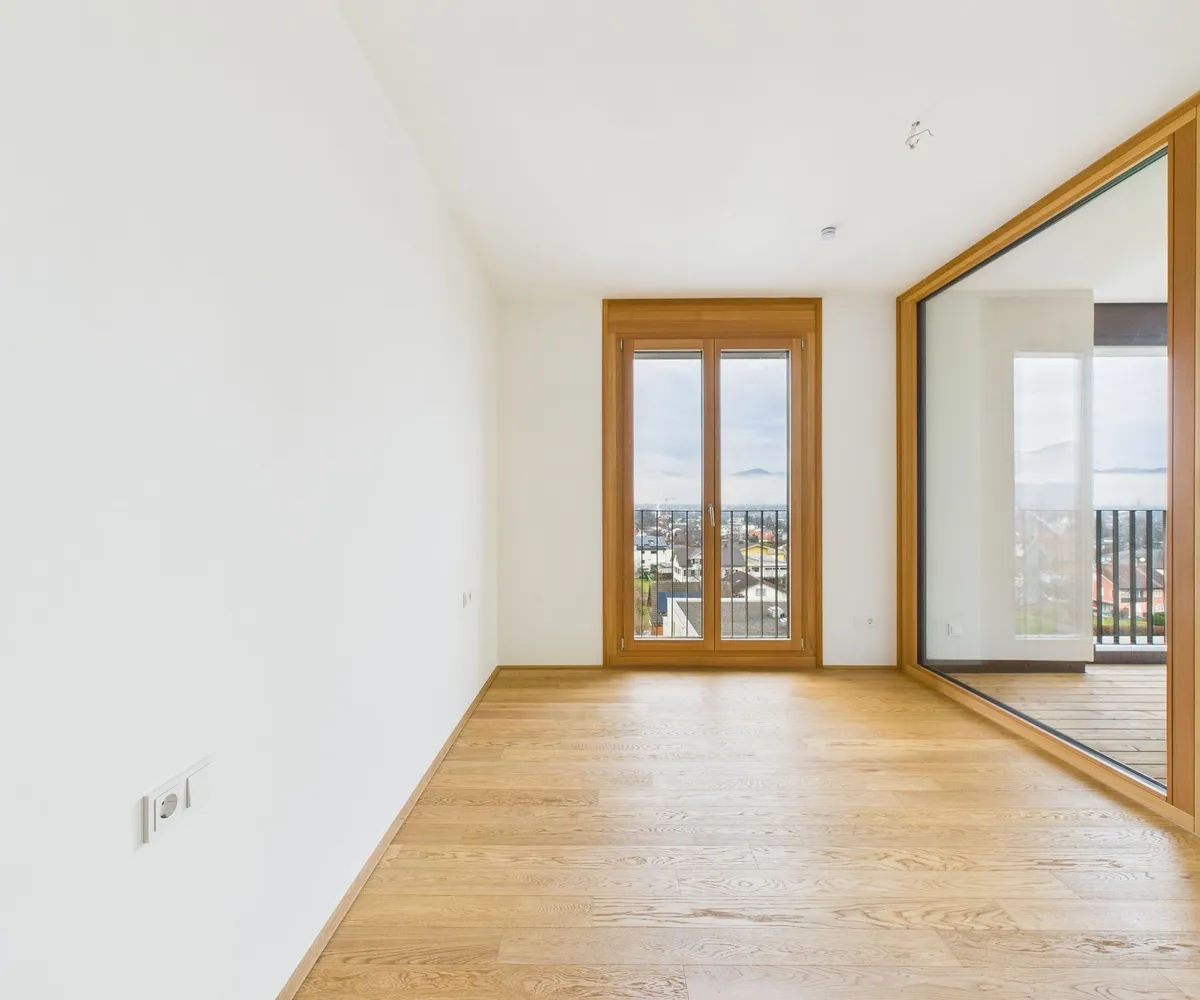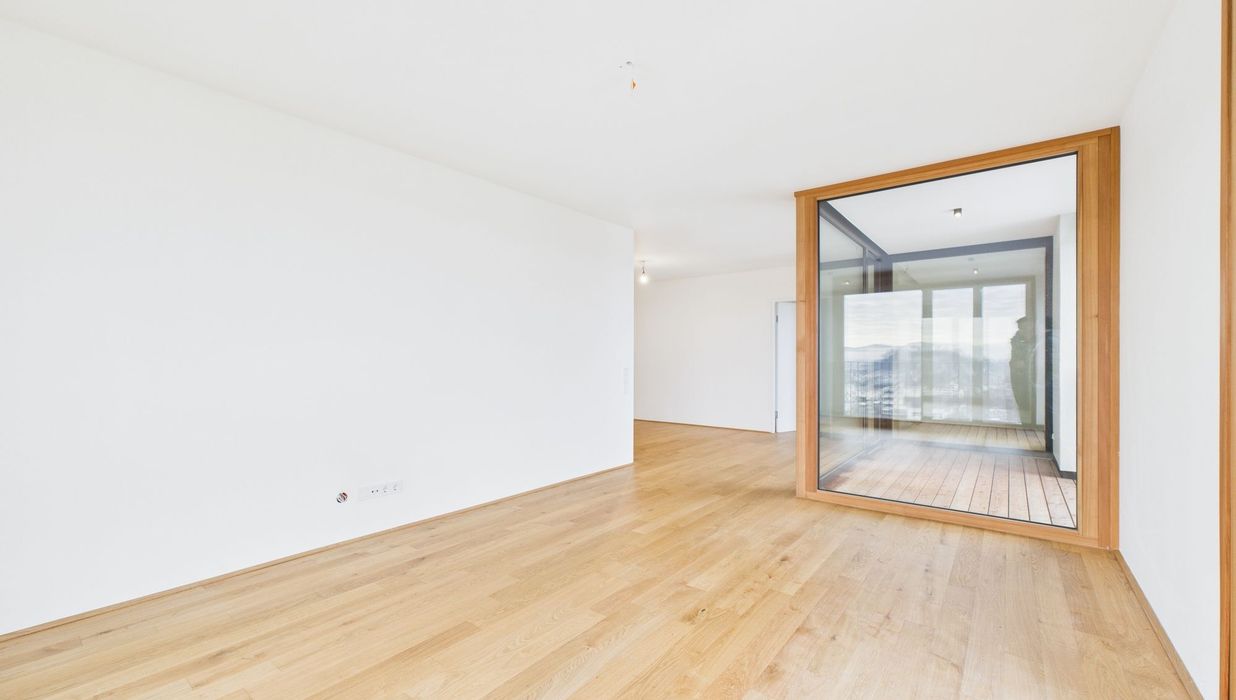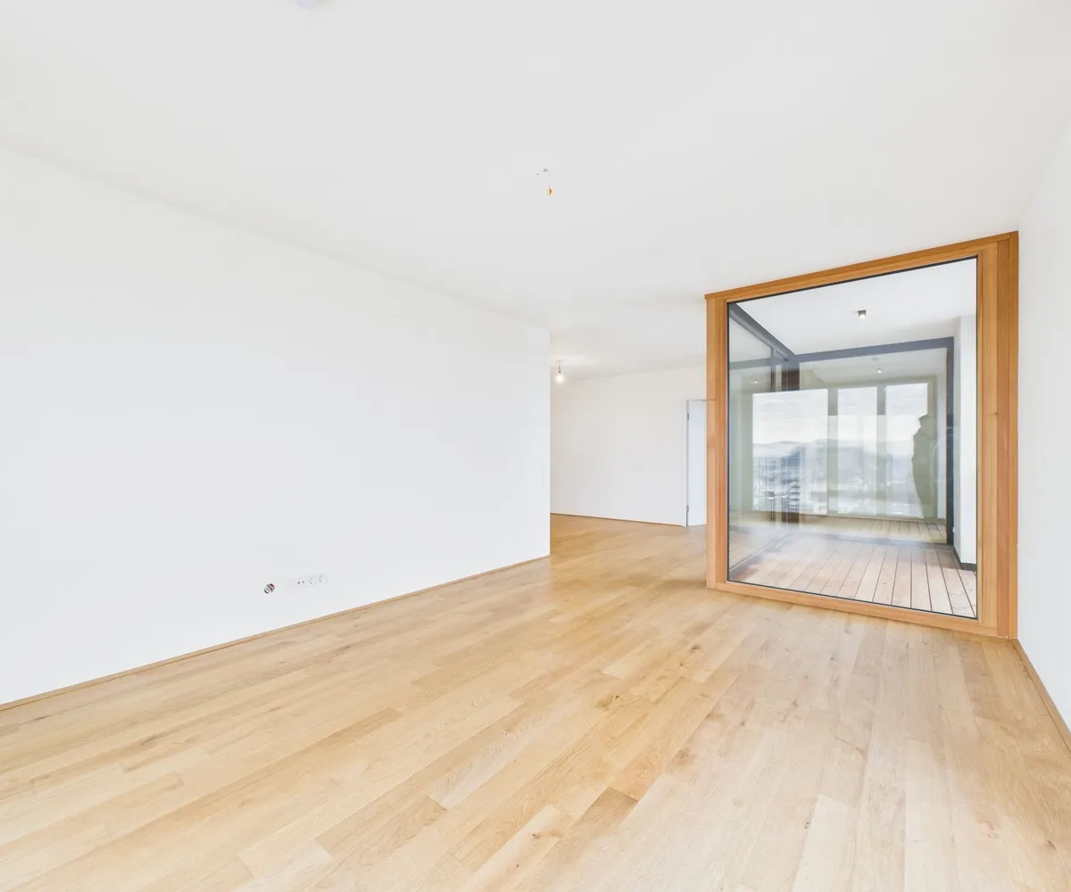 Edler Parkettboden in den Wohnräumen, zeitlose Fliesen im Badezimmer sowie große bodentiefe Fenster sorgen für ein helles, angenehmes Ankommen. Die eleganten Holz-Alu-Fenster unterstreichen den hochwertigen Charakter, während die Beschattung mittels Screens auf der Loggia für optimalen Komfort sorgt.