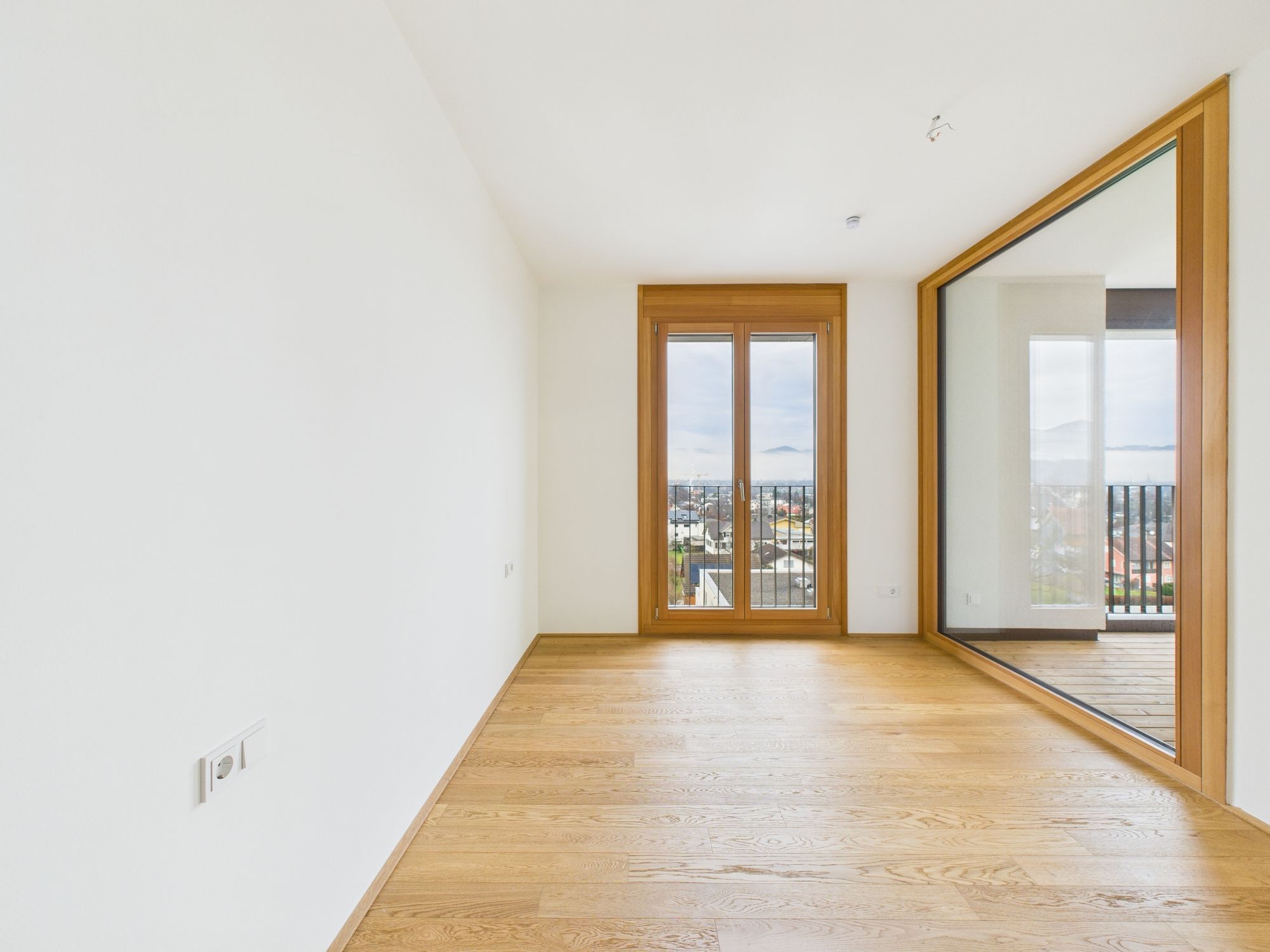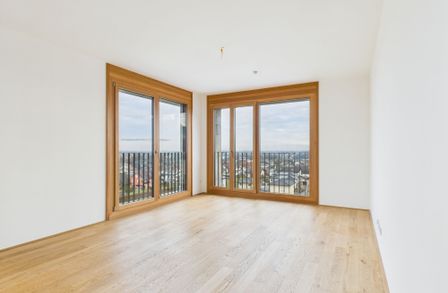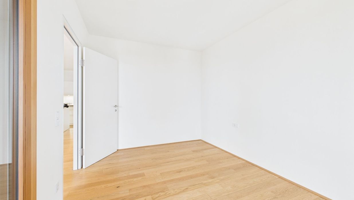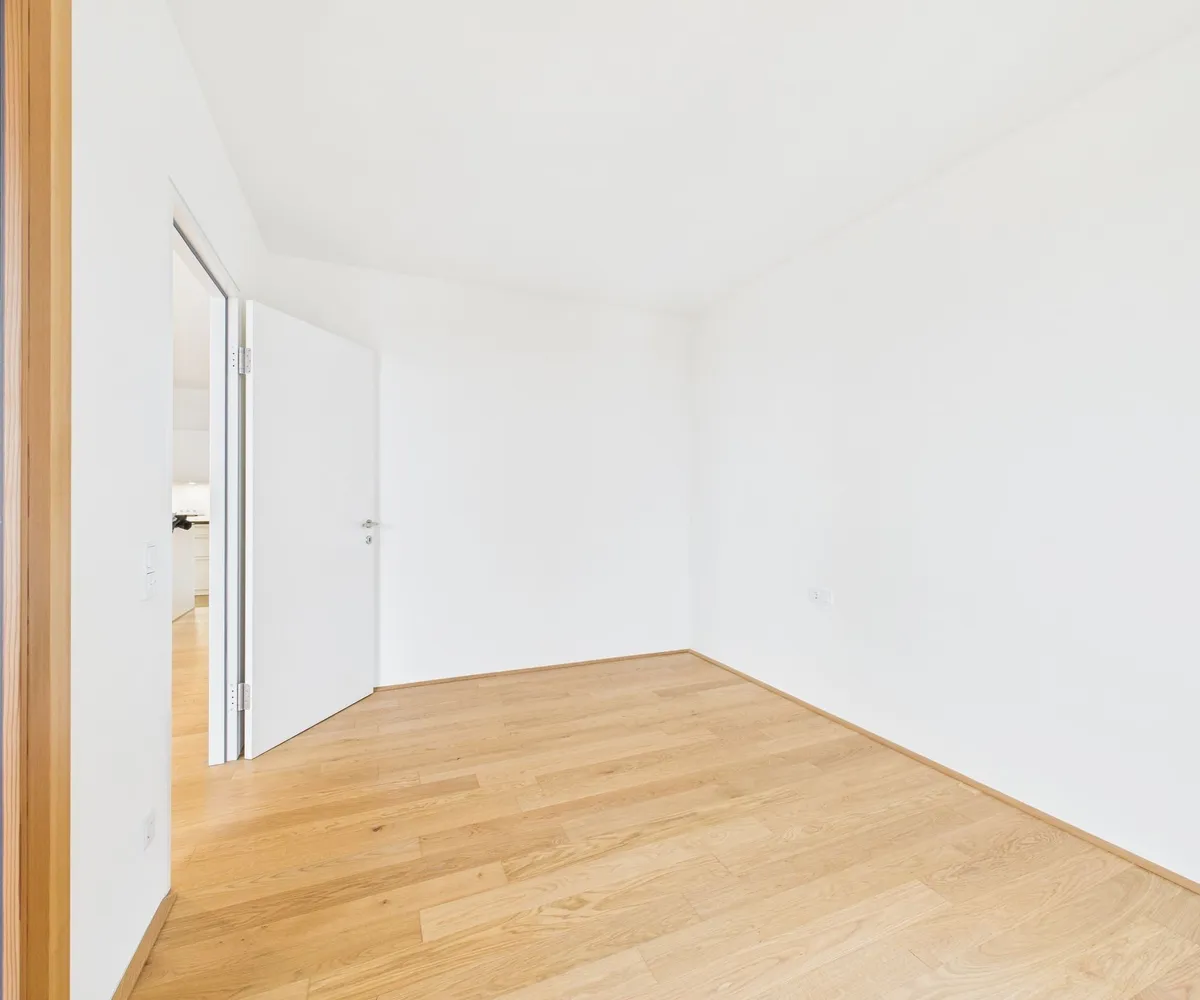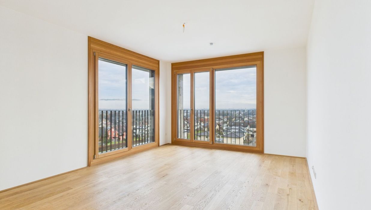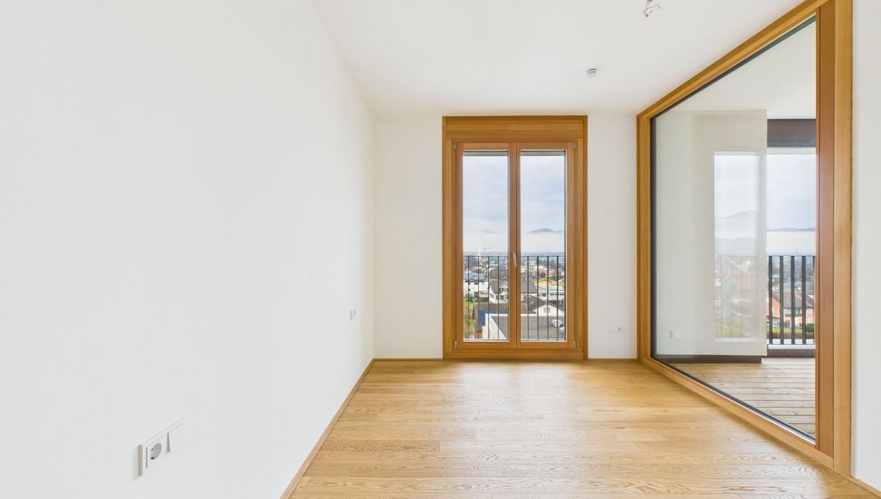 Edler Parkettboden in den Wohnräumen, zeitlose Fliesen im Badezimmer sowie große bodentiefe Fenster sorgen für ein helles, angenehmes Ankommen. Die eleganten Holz-Alu-Fenster unterstreichen den hochwertigen Charakter, während die Beschattung mittels Screens auf der Loggia für optimalen Komfort sorgt.