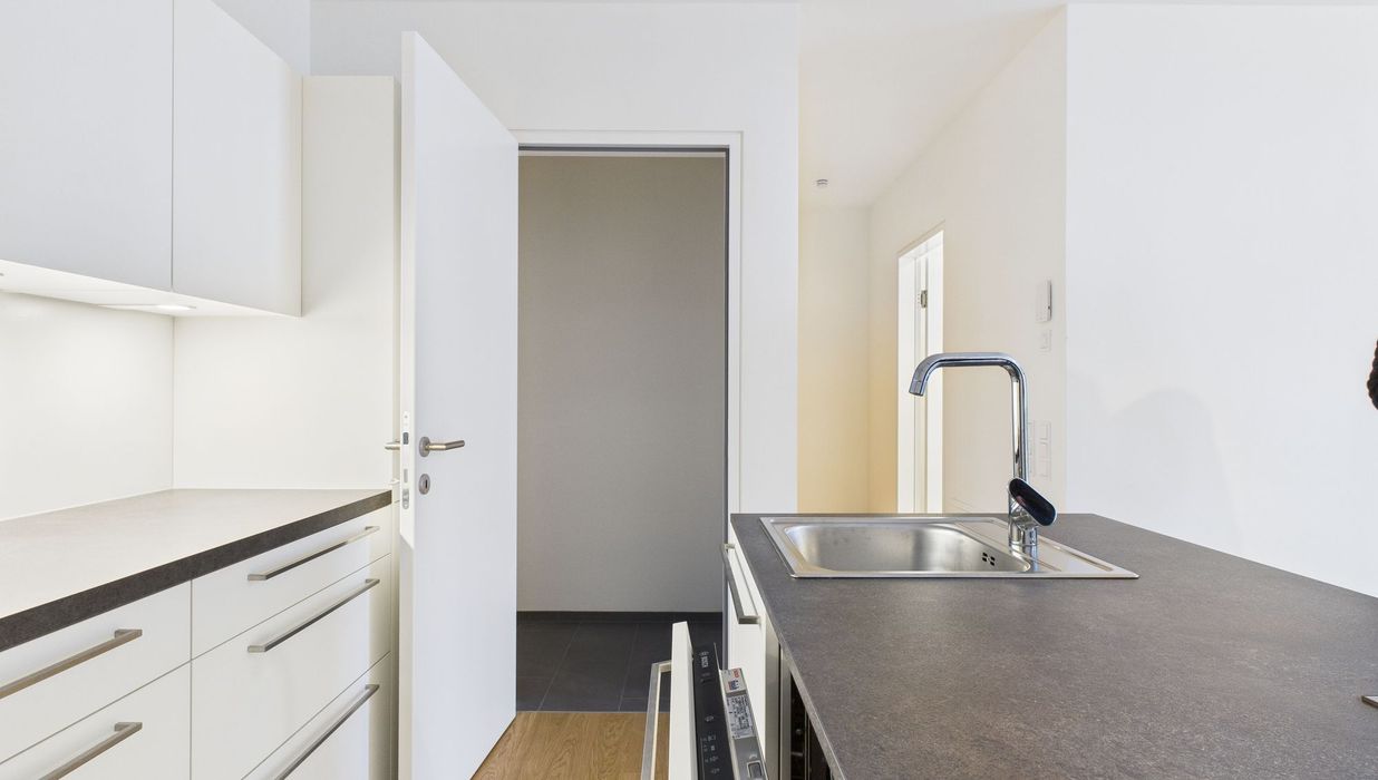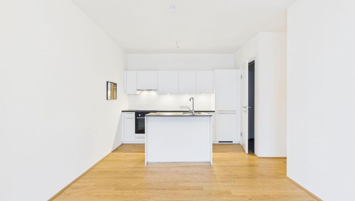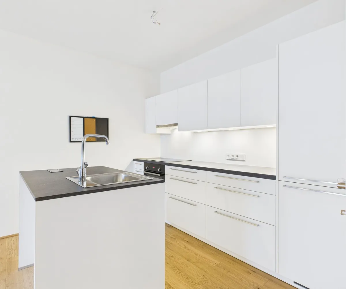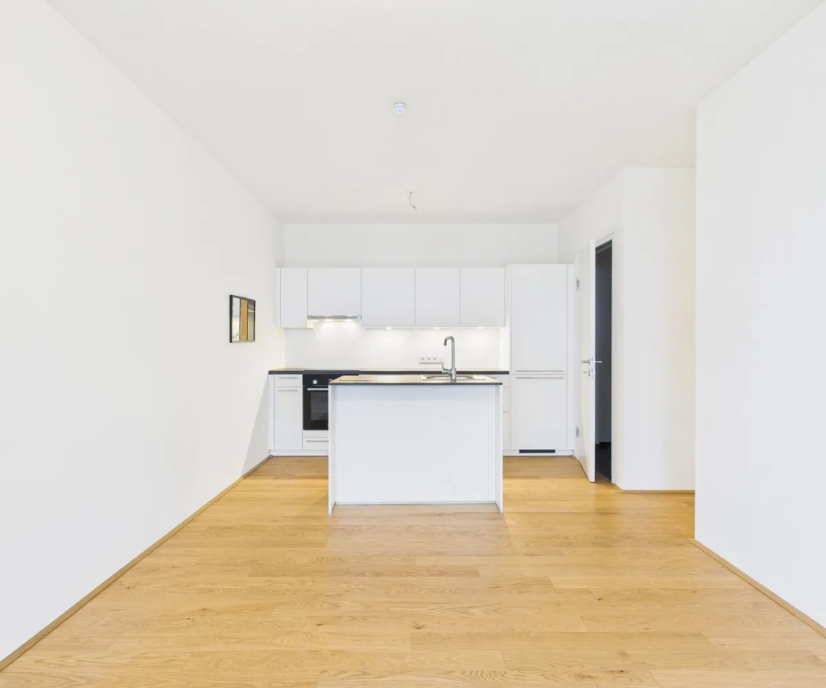 Die Ausstattung umfasst eine hochwertige Einbauküche mit Kücheninsel, Fußbodenheizung mit Einzelraumsteuerung sowie ein stilvolles Badezimmer mit Walk-in-Dusche. Die überdachte Loggia lädt dazu ein, entspannte Stunden in der Abendsonne zu genießen.