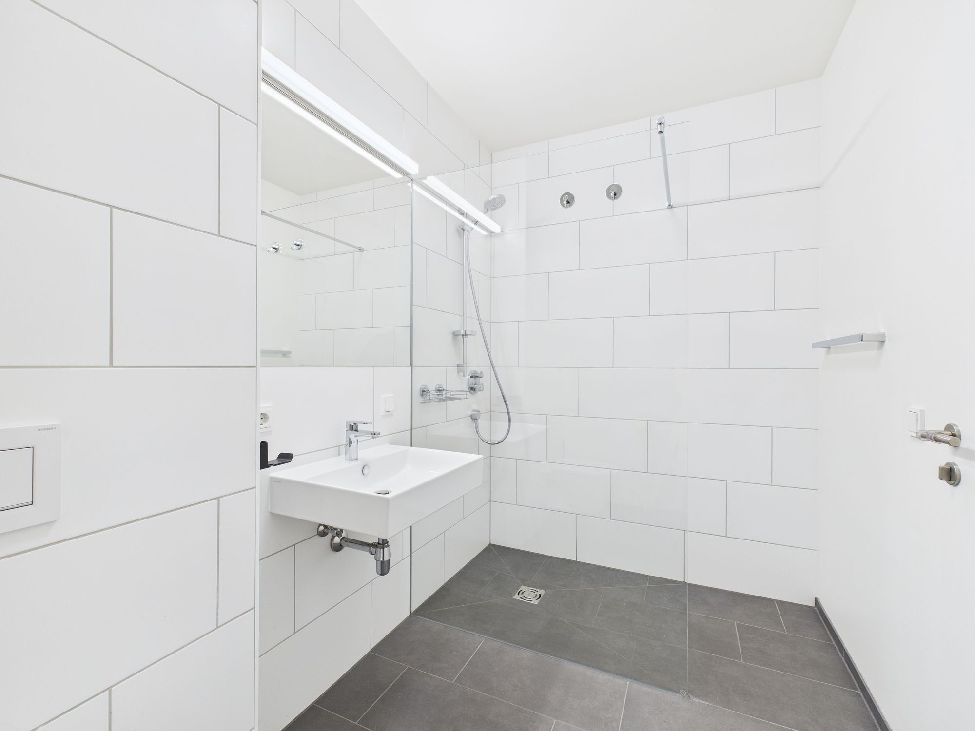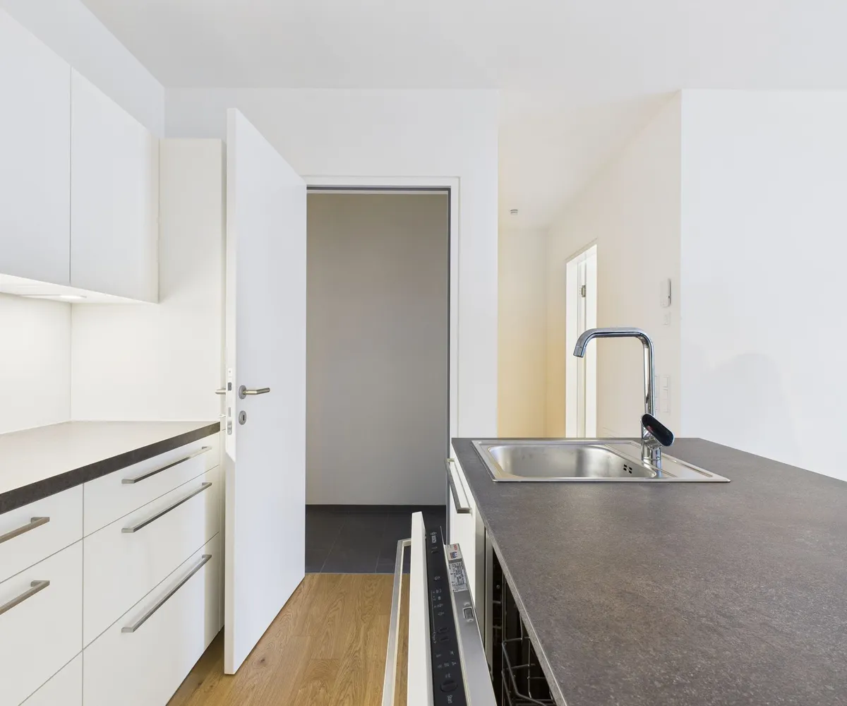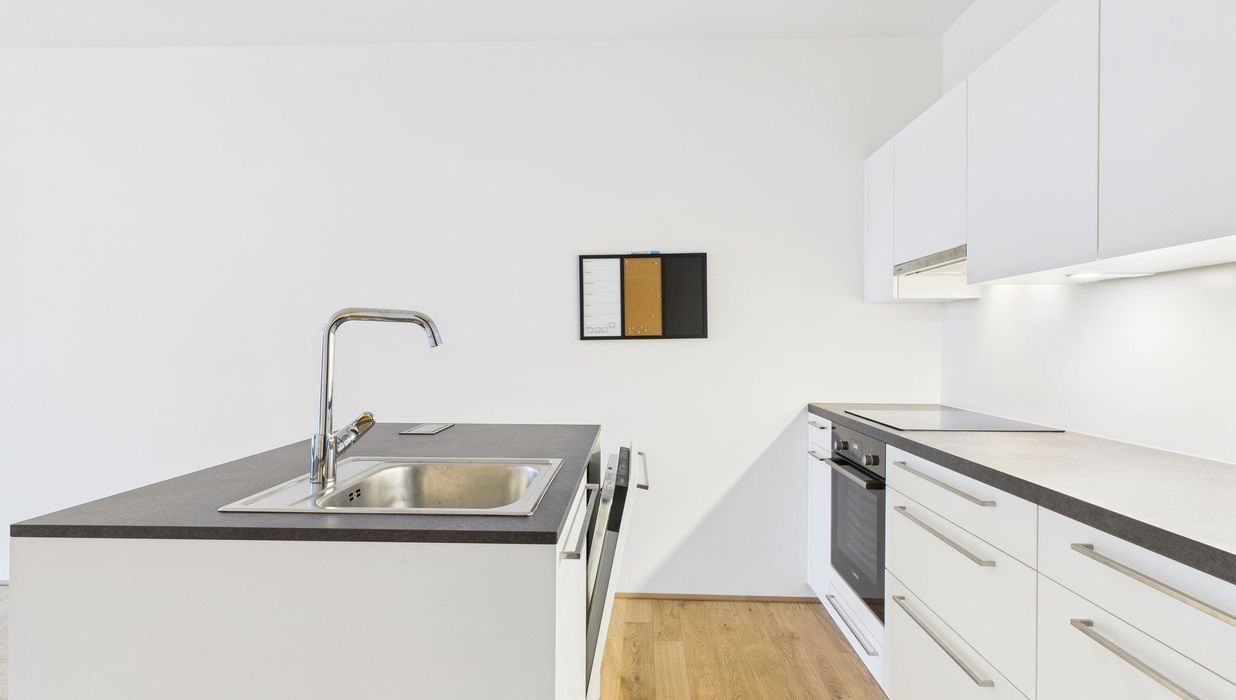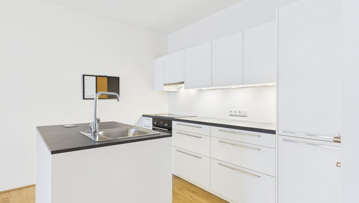 Die Ausstattung umfasst eine hochwertige Einbauküche mit Kücheninsel, Fußbodenheizung mit Einzelraumsteuerung sowie ein stilvolles Badezimmer mit Walk-in-Dusche. Die überdachte Loggia lädt dazu ein, entspannte Stunden in der Abendsonne zu genießen.