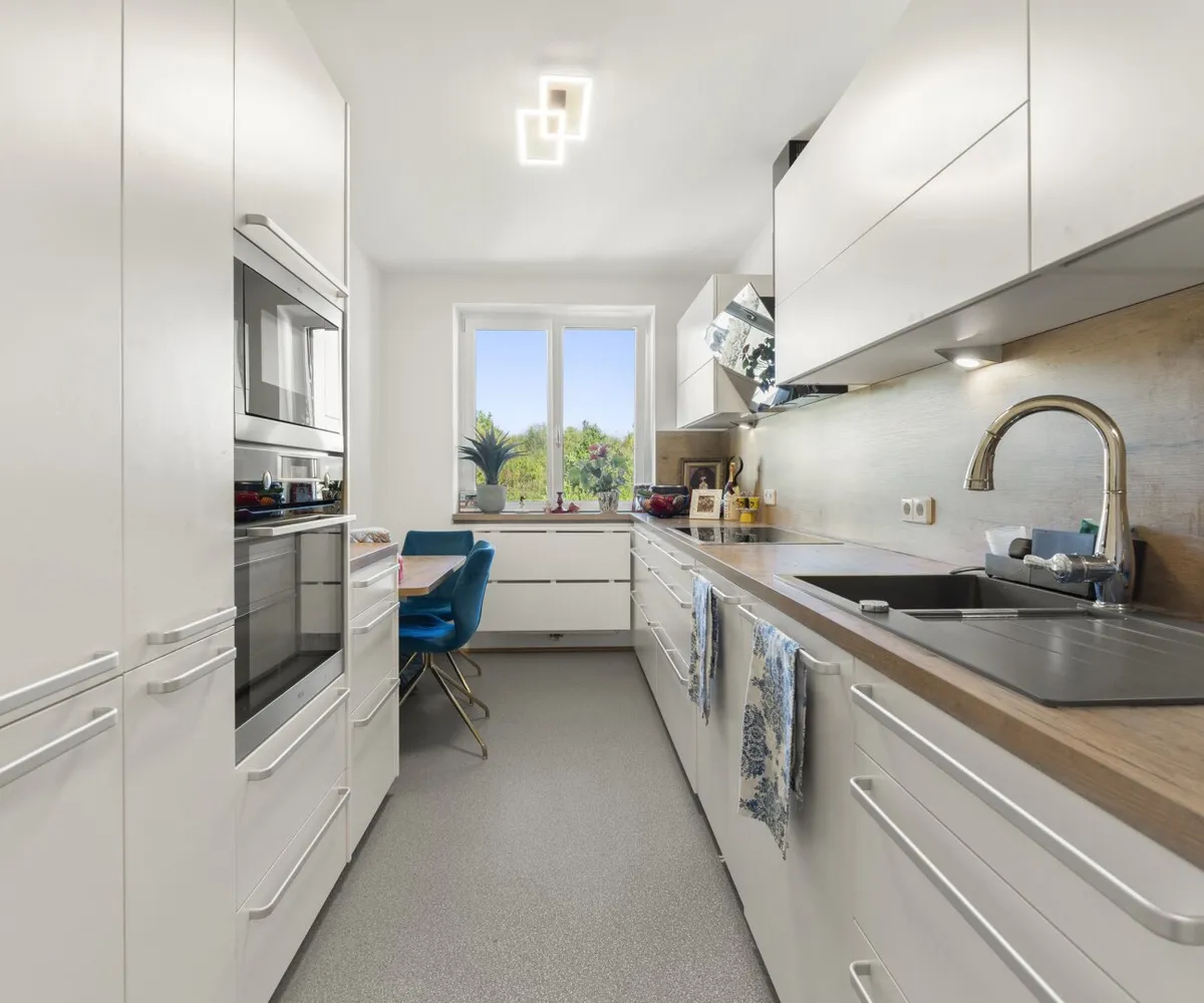 Möblierung: Neue Küche mit Geräten, neues Bad mit Badzimmermöbeln, Schiebeeinbaukasten im Vorraum, Essecke (Eckbank) mit Tisch und Stühlen.