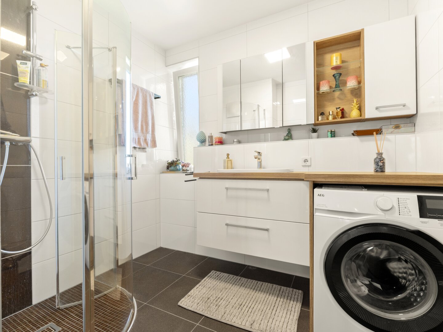 Bad: Neues Bad mit barrierefreier Dusche (Fußbodenheizung im Bad), Handtuchtrockner, Waschmaschinenanschluss und Fenster.