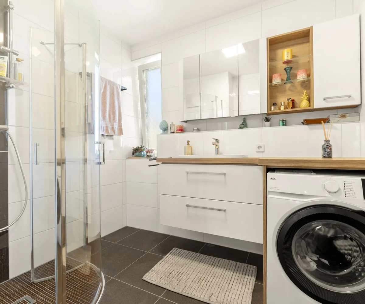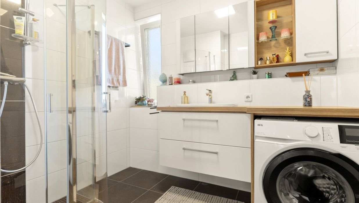 Bad: Neues Bad mit barrierefreier Dusche (Fußbodenheizung im Bad), Handtuchtrockner, Waschmaschinenanschluss und Fenster.