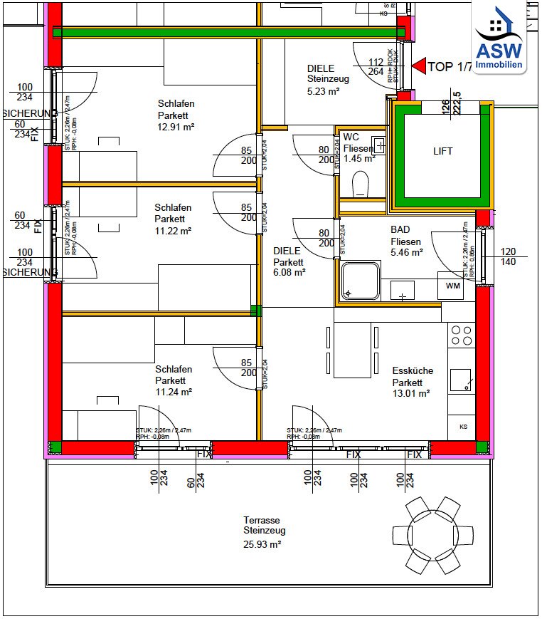 Achtung: Plan-Abweichung - keine durchgezogen Mauer zwischen Schlafzimmer und Esszimmer (siehe Fotos)
