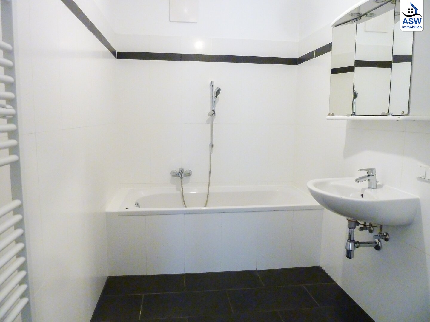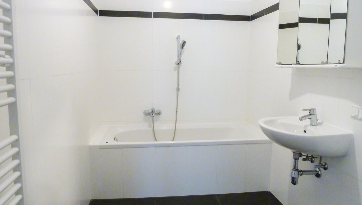 - Badezimmer mit Badewanne und Waschmaschinenanschluss