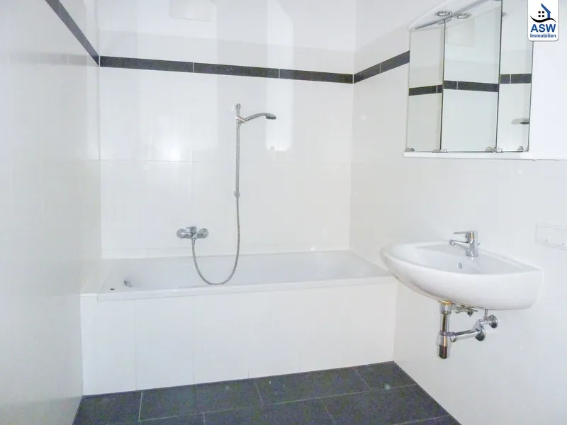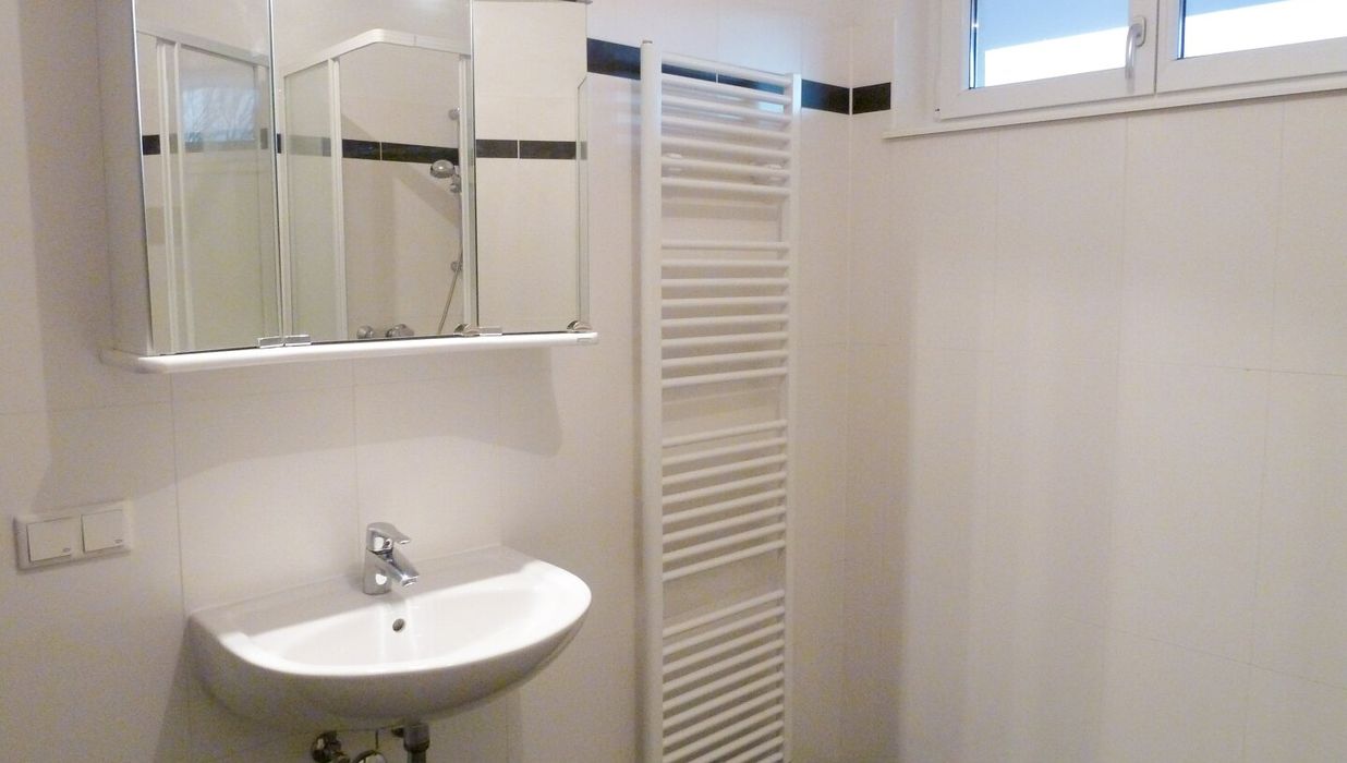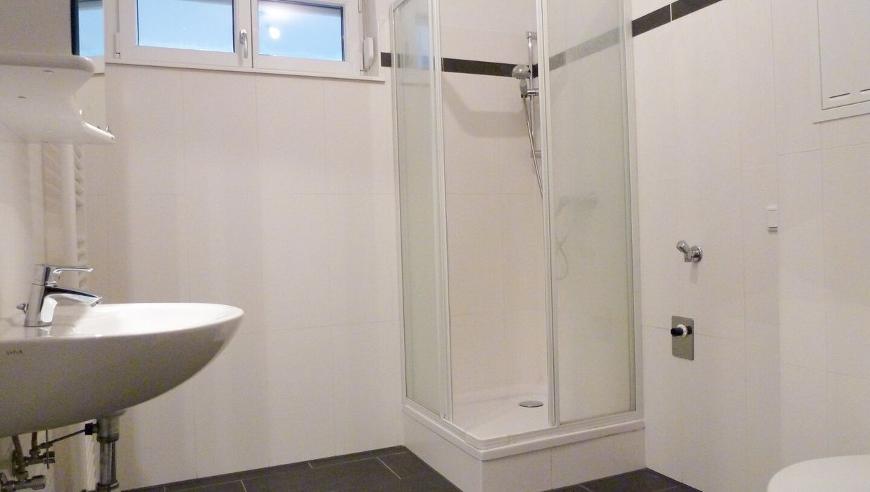 - Badezimmer mit Dusche und Waschmaschinenanschluss