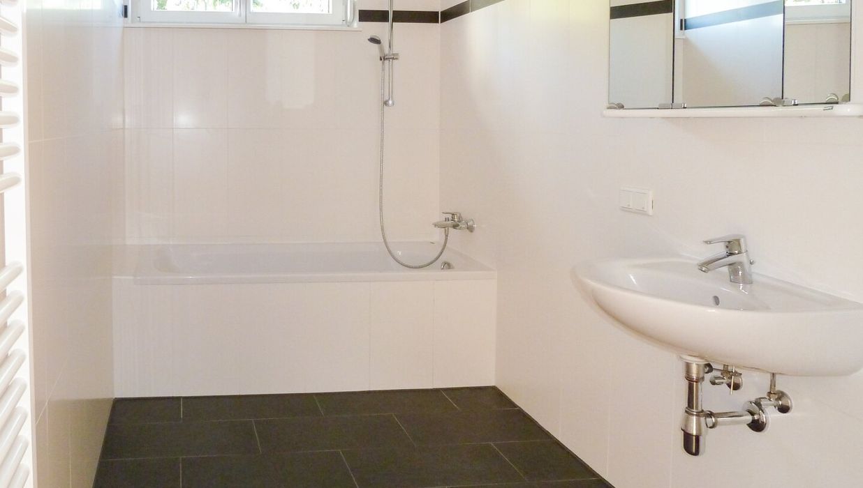 - Badezimmer mit Badewanne und Waschmaschinenanschluss