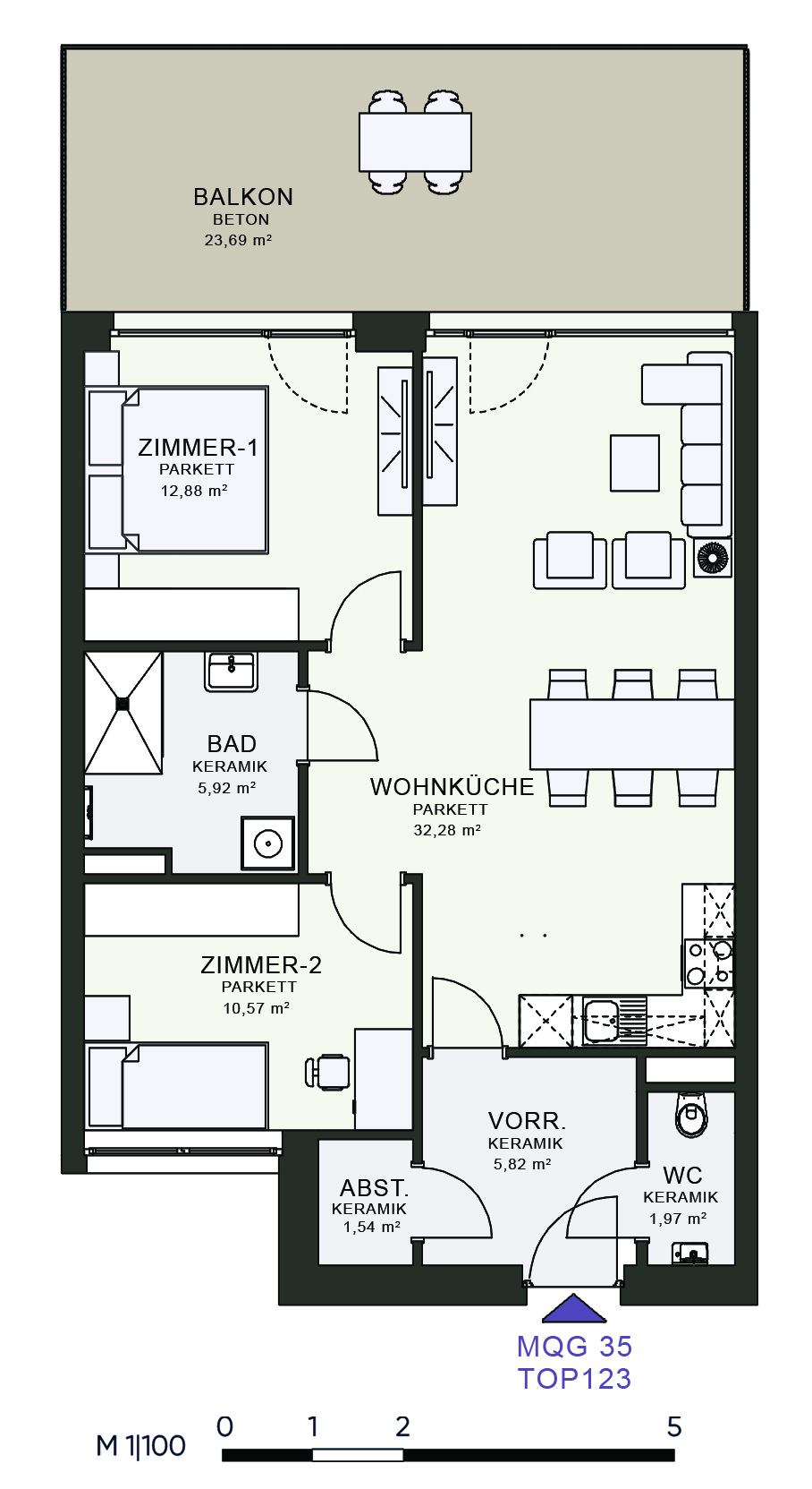Das MQG wird als siebengeschossige bis zehngeschossige Hofstruktur realisiert und überzeugt durch eine hochwertige architektonische Umsetzung. Die vier Baukörper sind jeweils zweihüftig organisiert und über großzügige, bis zu acht Meter breite Längsatrien erschlossen, die als kommunikative Begegnungszonen dienen. Dank transparenter Glasüberdachungen sind diese Bereiche wettergeschützt und gleichzeitig lichtdurchflutet, wodurch eine angenehme Atmosphäre entsteht. Zudem ermöglicht dieses Konzept eine optimale Querlüftung aller Wohnungen.
