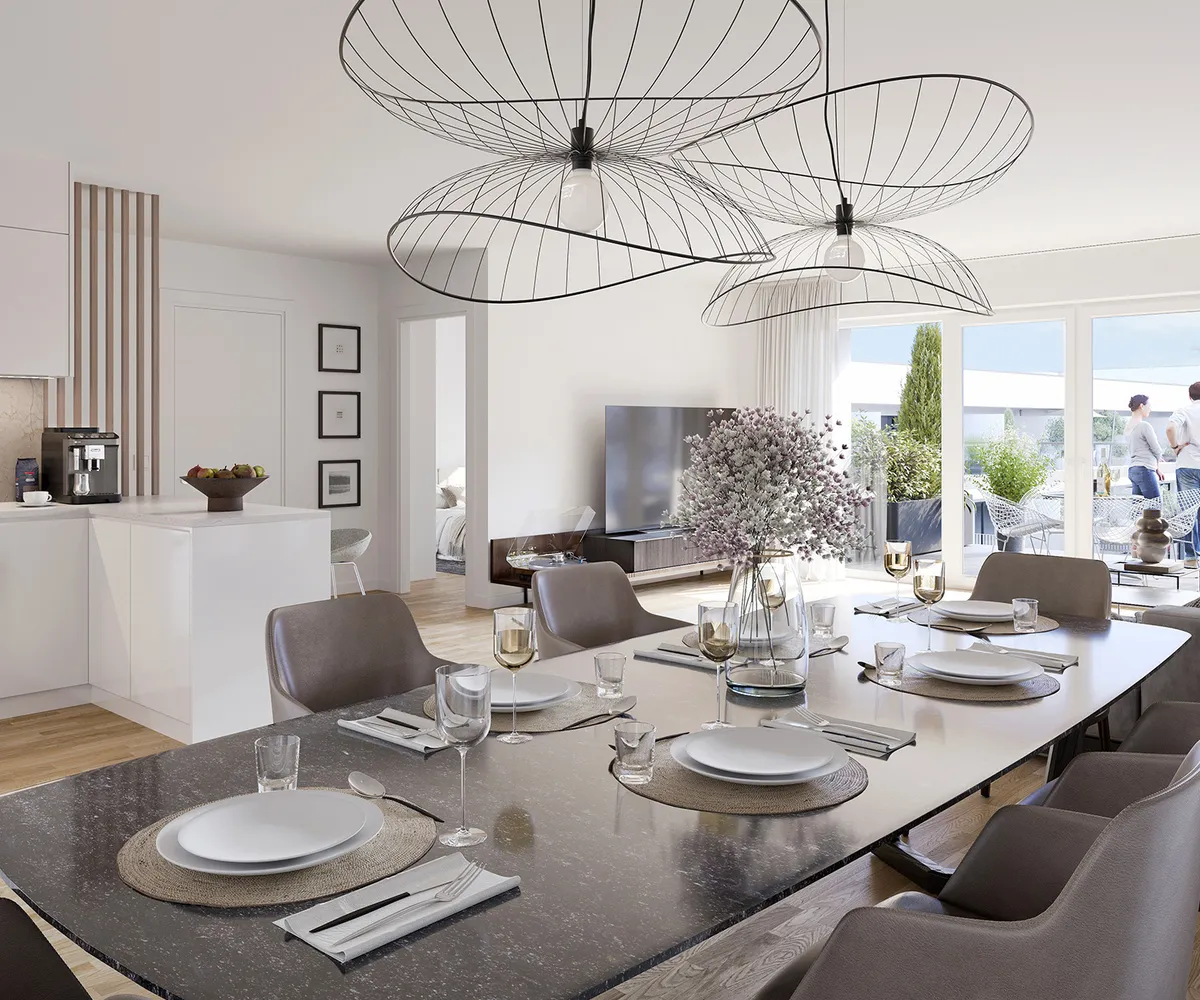 Die Wohnungen bieten hochwertige Ausstattungsdetails wie Parkett- oder Keramikböden, maßgefertigte Einbauküchen, Fußbodenheizung über Fernwärme, eigene Kellerabteile sowie private Außenflächen in Form von Balkonen oder Gärten. Sämtliche Einheiten sind barrierefrei über Aufzüge oder überdachte Erschließungswege zugänglich.