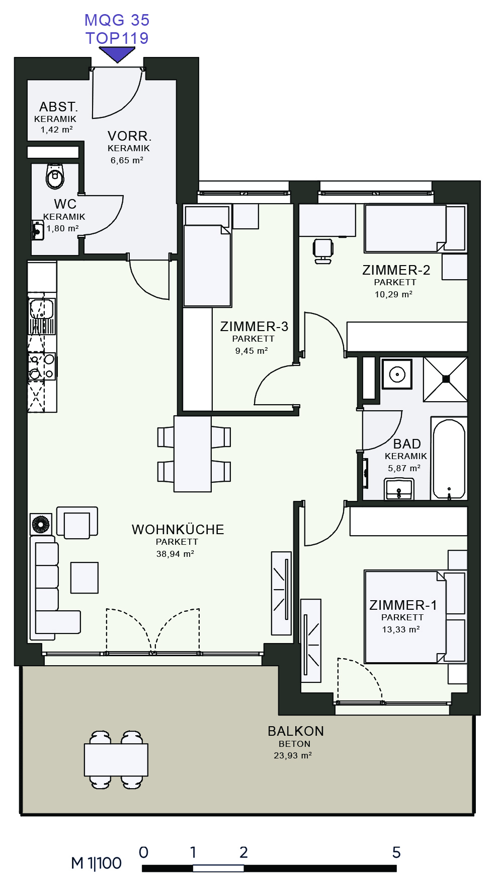 Das MQG wird als siebengeschossige bis zehngeschossige Hofstruktur realisiert und überzeugt durch eine hochwertige architektonische Umsetzung. Die vier Baukörper sind jeweils zweihüftig organisiert und über großzügige, bis zu acht Meter breite Längsatrien erschlossen, die als kommunikative Begegnungszonen dienen. Dank transparenter Glasüberdachungen sind diese Bereiche wettergeschützt und gleichzeitig lichtdurchflutet, wodurch eine angenehme Atmosphäre entsteht. Zudem ermöglicht dieses Konzept eine optimale Querlüftung aller Wohnungen.
