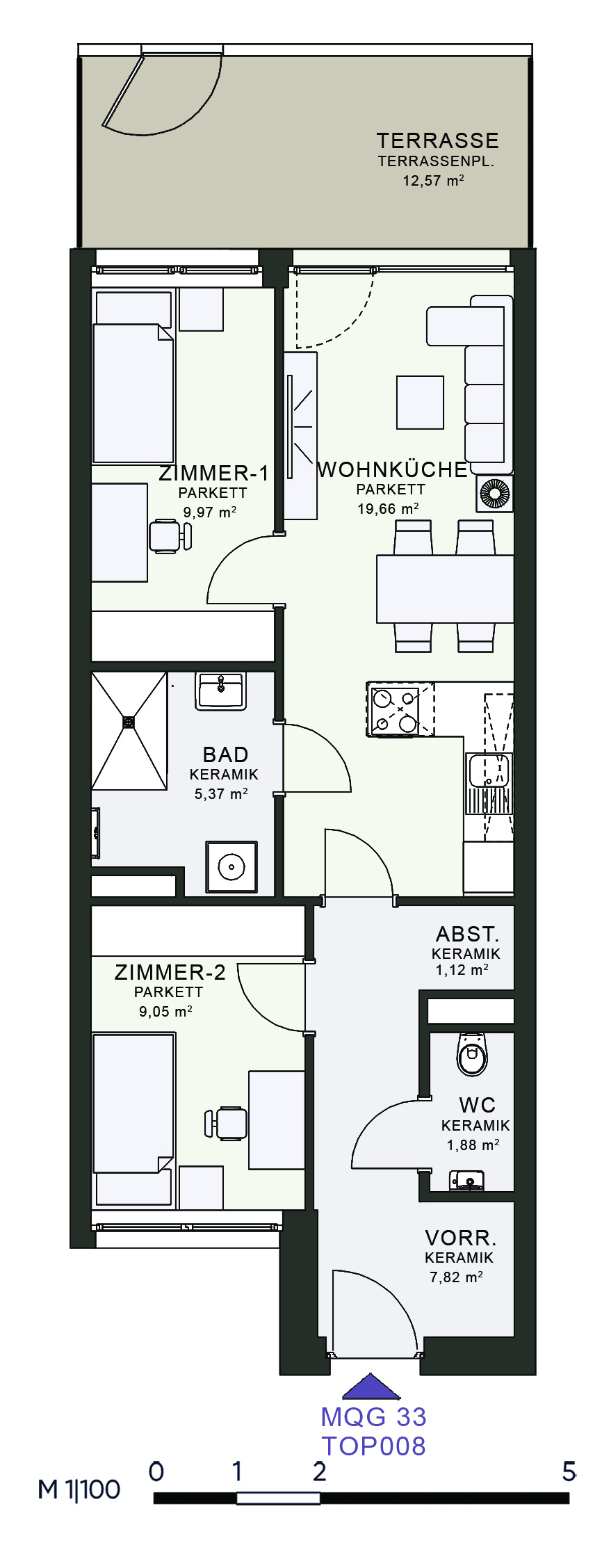 Das MQG wird als siebengeschossige bis zehngeschossige Hofstruktur realisiert und überzeugt durch eine hochwertige architektonische Umsetzung. Die vier Baukörper sind jeweils zweihüftig organisiert und über großzügige, bis zu acht Meter breite Längsatrien erschlossen, die als kommunikative Begegnungszonen dienen. Dank transparenter Glasüberdachungen sind diese Bereiche wettergeschützt und gleichzeitig lichtdurchflutet, wodurch eine angenehme Atmosphäre entsteht. Zudem ermöglicht dieses Konzept eine optimale Querlüftung aller Wohnungen.