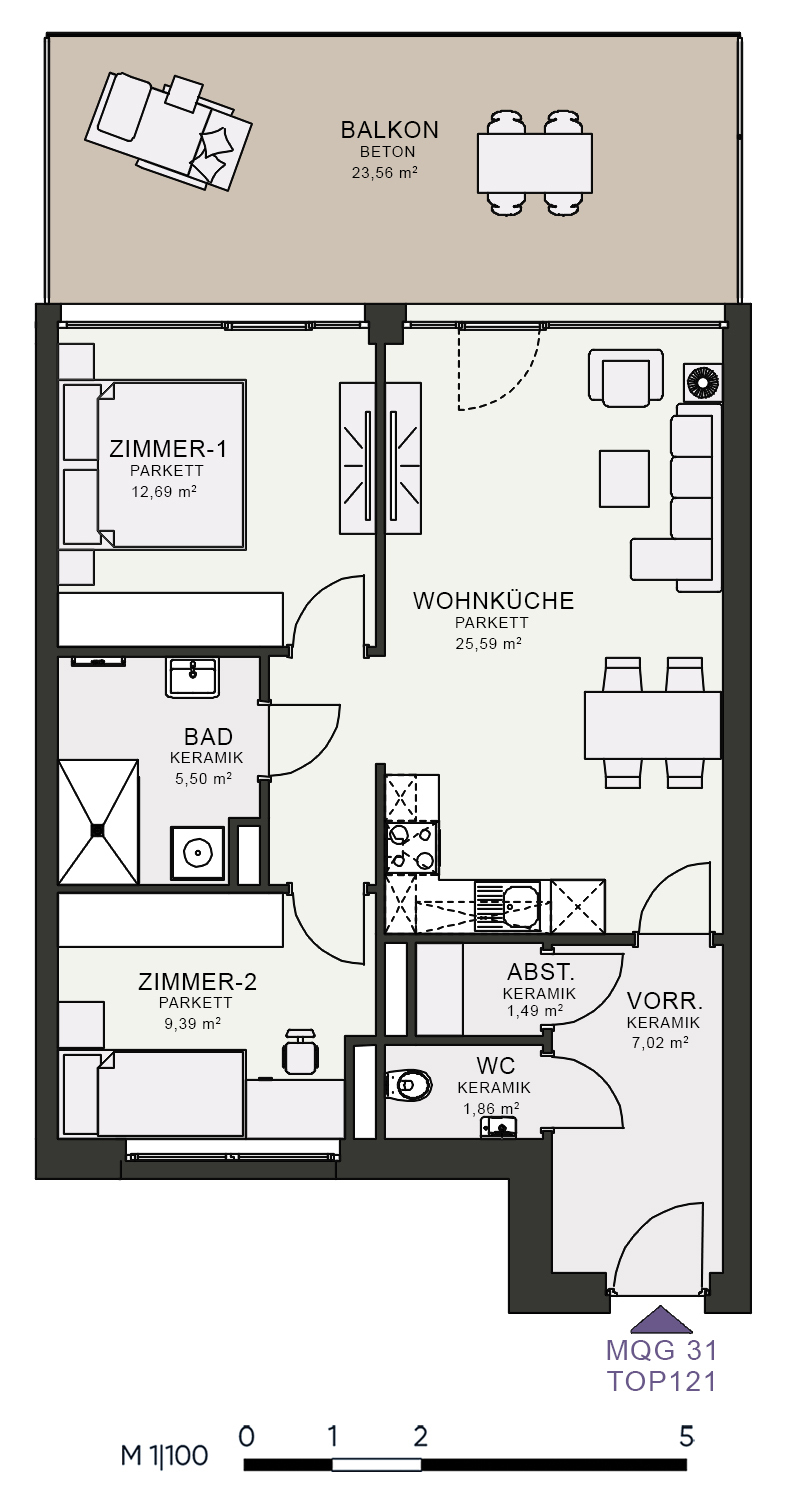 Das MQG wird als siebengeschossige bis zehngeschossige Hofstruktur realisiert und überzeugt durch eine hochwertige architektonische Umsetzung. Die vier Baukörper sind jeweils zweihüftig organisiert und über großzügige, bis zu acht Meter breite Längsatrien erschlossen, die als kommunikative Begegnungszonen dienen. Dank transparenter Glasüberdachungen sind diese Bereiche wettergeschützt und gleichzeitig lichtdurchflutet, wodurch eine angenehme Atmosphäre entsteht. Zudem ermöglicht dieses Konzept eine optimale Querlüftung aller Wohnungen.