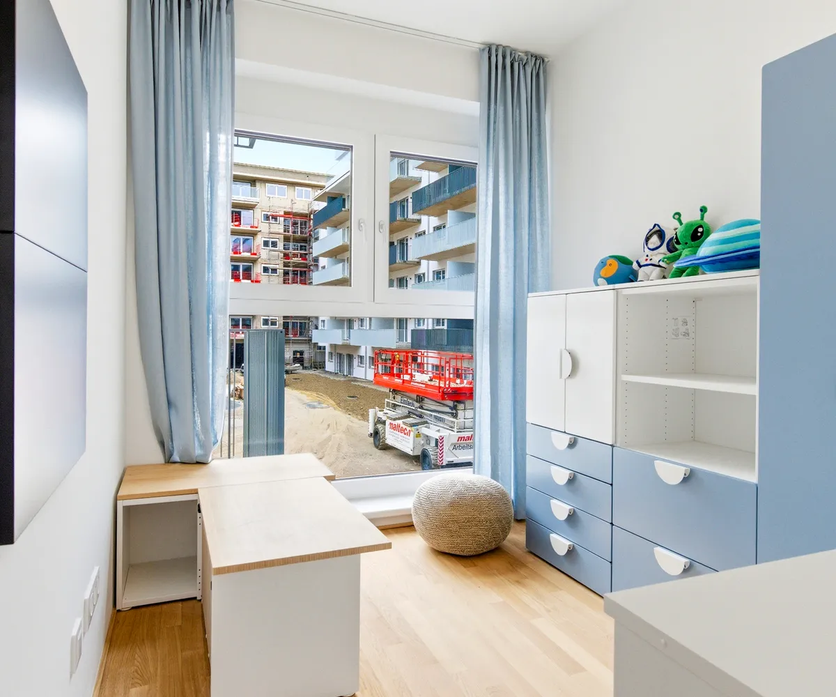 Die Wohnungen bieten hochwertige Ausstattungsdetails wie Parkett- oder Keramikböden, maßgefertigte Einbauküchen, Fußbodenheizung über Fernwärme, eigene Kellerabteile sowie private Außenflächen in Form von Balkonen oder Gärten. Sämtliche Einheiten sind barrierefrei über Aufzüge oder überdachte Erschließungswege zugänglich.